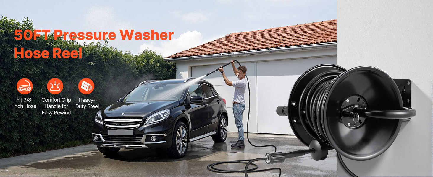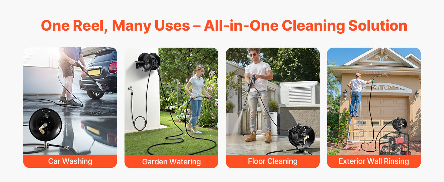 Vhodná na umývanie áut, zavlažovanie záhrady, čistenie pôdy a umývanie vonkajších stien. Komplexné riešenie na uskladnenie hadice na viacero čistiacich úloh, ktoré zvyšuje pohodlie.