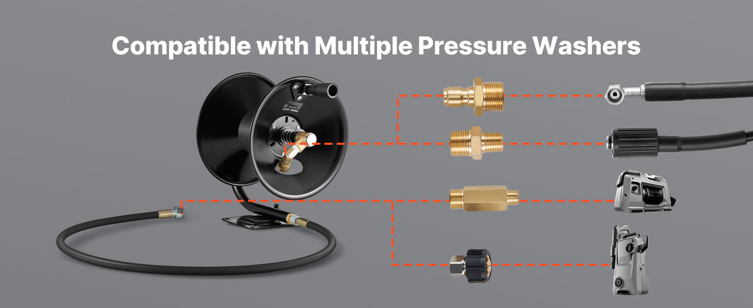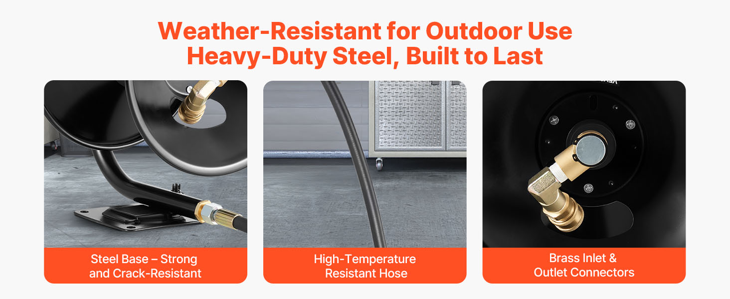 Vyrobená z pevnej ocele s tepelne odolnými hadicami a mosadznými vstupnými/výstupnými konektormi. Zosilnená oceľová základňa odolá náročným vonkajším podmienkam a rieši bežné problémy s odolnosťou tradičných hadicových navijakov.