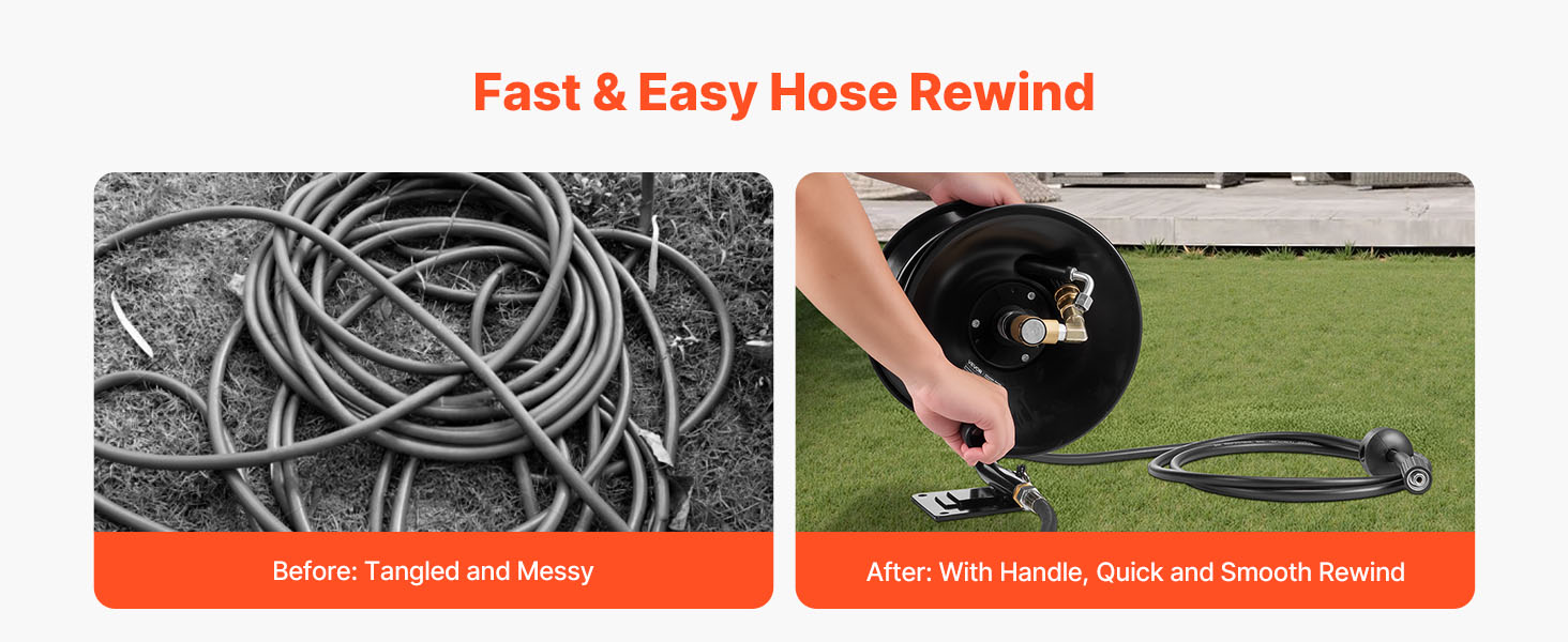 Vybavený rukoväťou umožňuje jednoduché a rýchle navíjanie hadice, čím sa znižuje potreba zdĺhavého ručného navíjania. Táto konštrukcia zvyšuje prevádzkovú efektívnosť a rieši časovo náročné navíjanie tradičných hadíc.