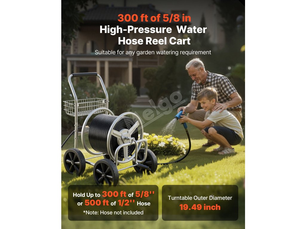 Tento vozík na navíjanie vodnej hadice, vyrobený z ocele Q235A s mosadzným príslušenstvom, pojme 500 stôp (15240 cm) hadice 1/2" (12,7 mm) alebo 300 stôp (9144 cm) hadice 5/8" (15,88 mm). Prevodové navíjanie umožňuje jednoduché navíjanie, zatiaľ čo jeho nízky stred a protišmykové kolieska ho udržia stabilný na tráve, štrku alebo nerovnom teréne.