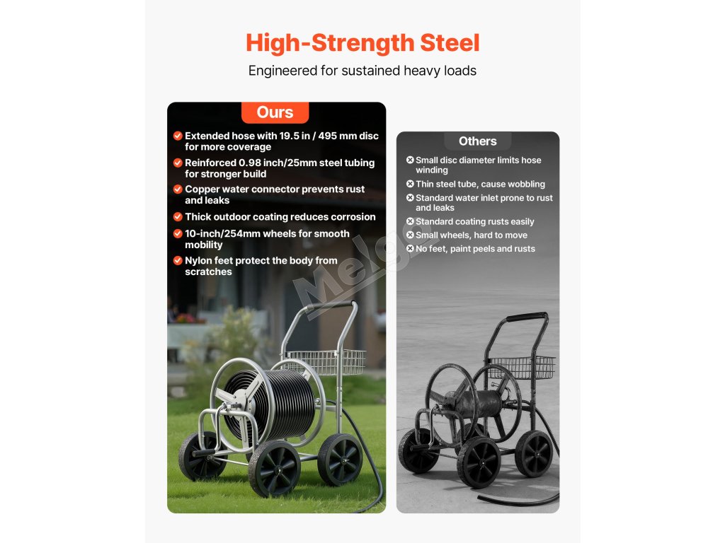 Vďaka pevnej oceľovej konštrukcii zostáva náš hadicový navijak na kolieskach počas používania stabilný. Povrchová úprava práškovou farbou zvyšuje odolnosť proti korózii a mosadzné konektory zabezpečujú pevné a netesné pripojenie hadice, vďaka čomu sú úlohy čistenia a zavlažovania v exteriéri bezproblémové a spoľahlivé.