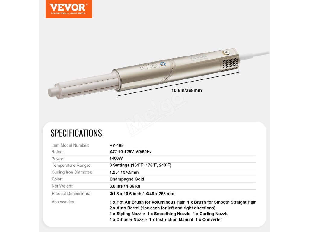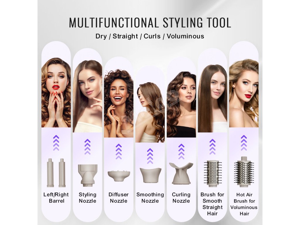 Obsahuje 8 multifunkčných doplnkov: ľavý/pravý automatický barel, objemovú teplovzdušnú kefu, uhladzovaciu narovnávaciu kefu, stylingovú trysku, difúznu trysku, uhladzovaciu trysku a kulmu. Súprava podporuje rôzne účesy, od kučier až po rovné vlasy, vďaka čomu je úprava vlasov príjemnejšia.