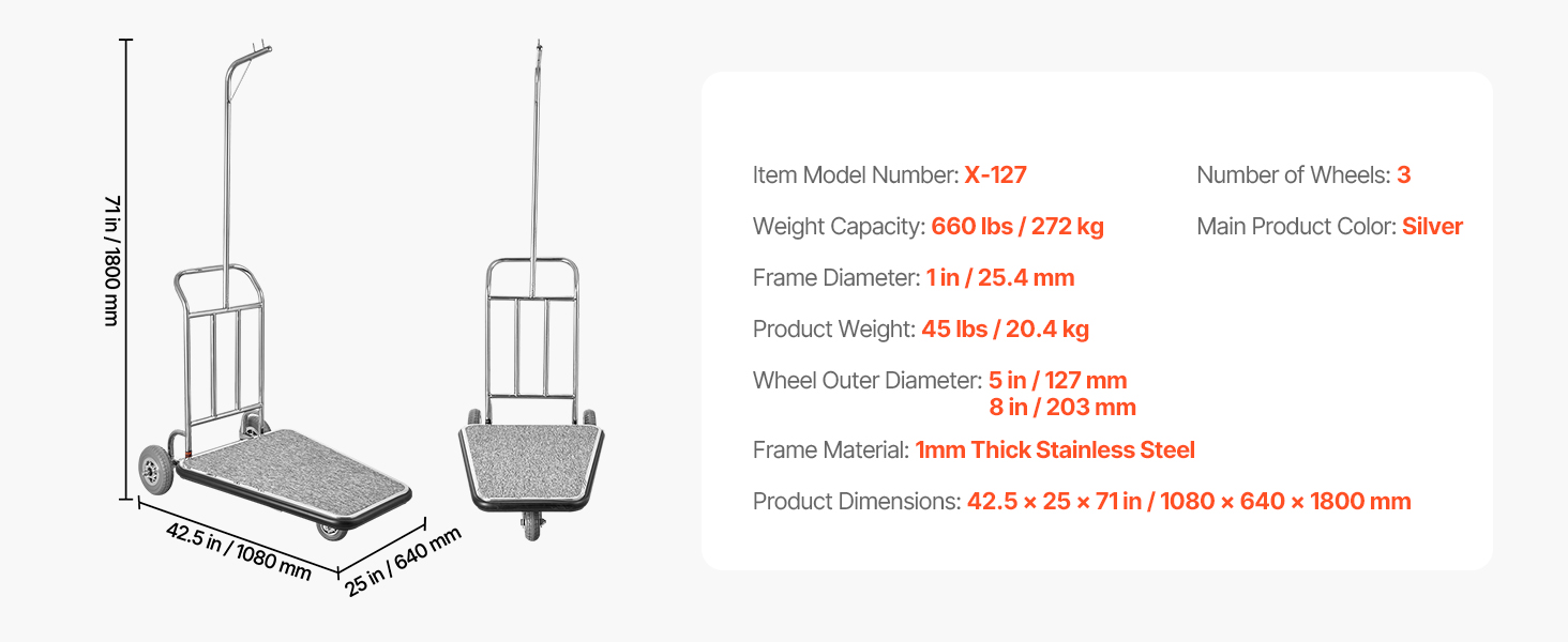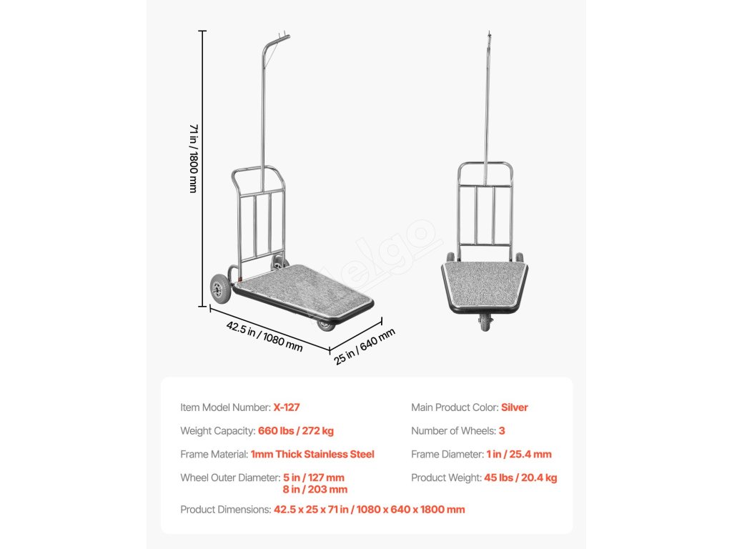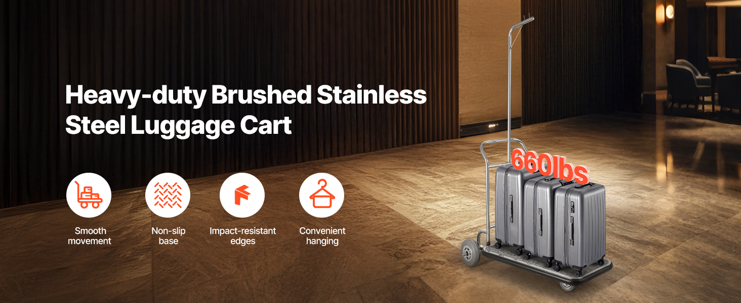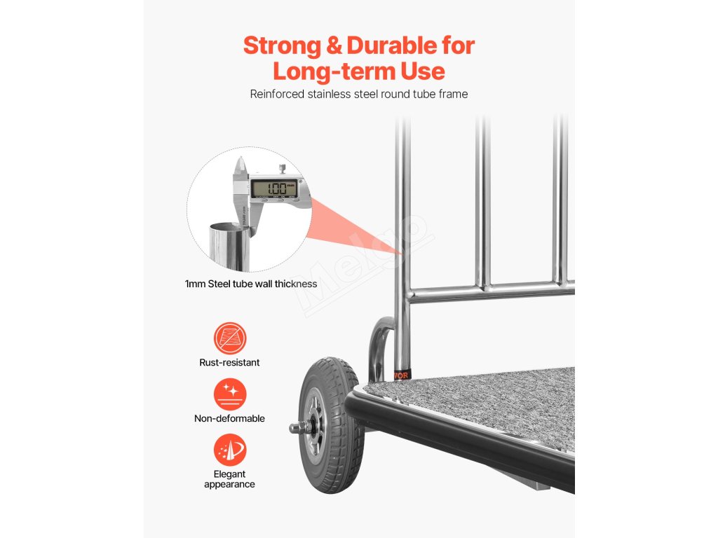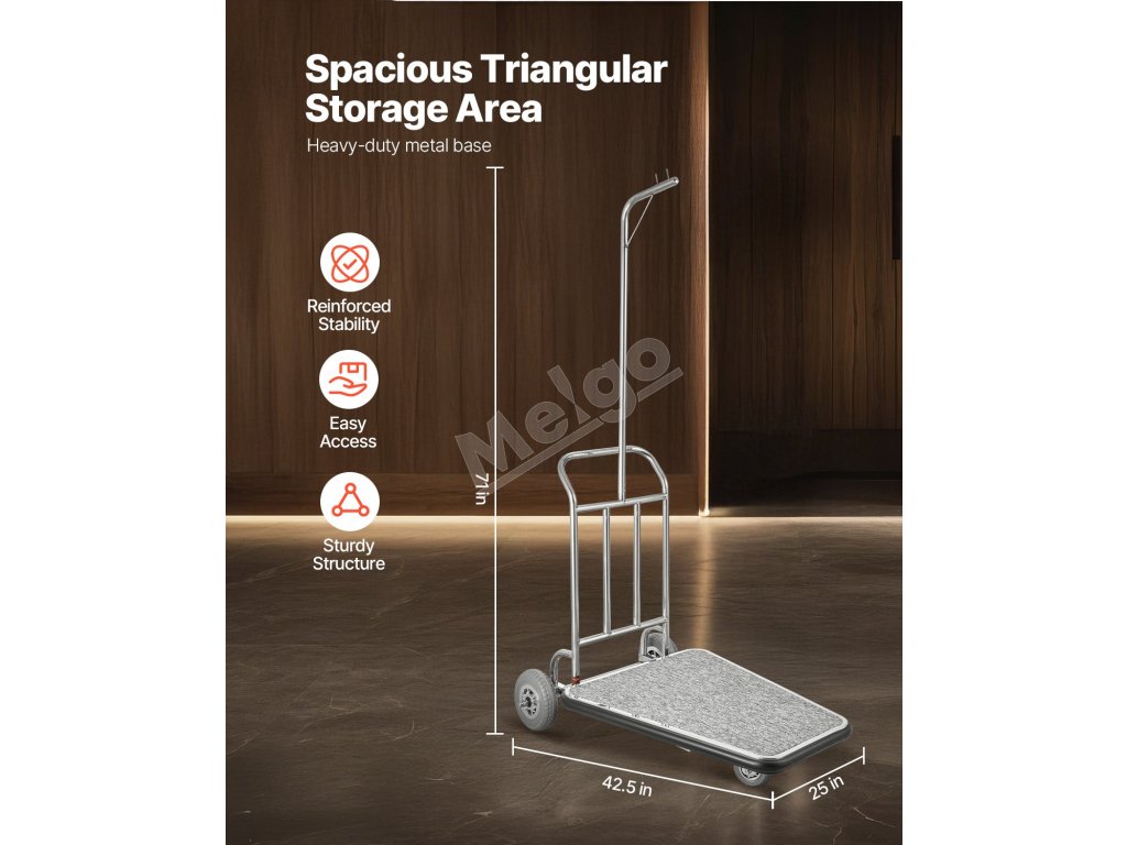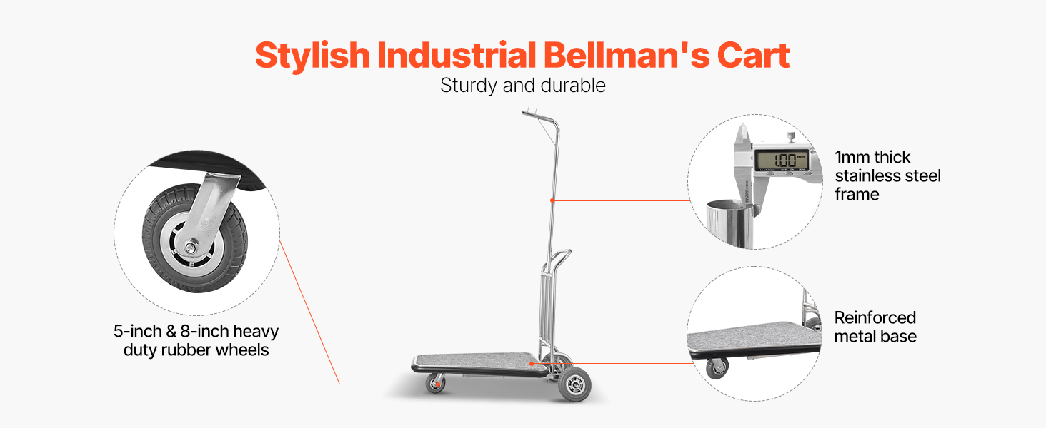 Tento bellmanský vozík je vyrobený s 1 mm hrubým rámom z nehrdzavejúcej ocele, vďaka čomu si zachováva svoj lesk. Odolná základňa, jedno 5-palcové a dve 8-palcové gumené kolieska zaručujú hladký a stabilný pohyb aj pri plnom zaťažení.
