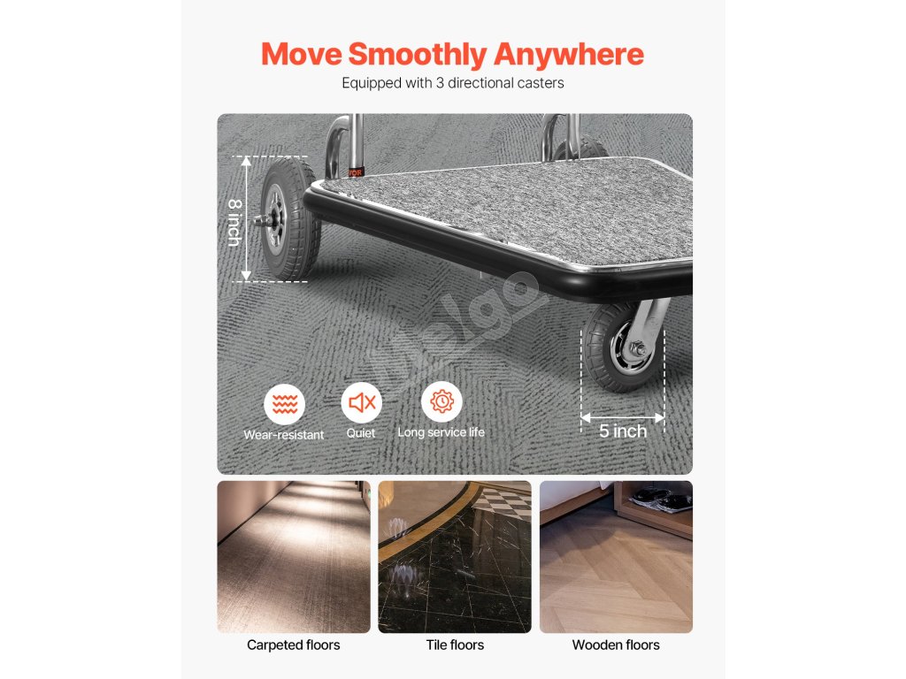 Náš hotelový vozík na batožinu sa bez námahy kĺže po dlaždiciach, koberci, betóne alebo drevených podlahách. Vďaka trom smerovým kolieskam nebol presun batožiny nikdy jednoduchší a pohodlnejší.