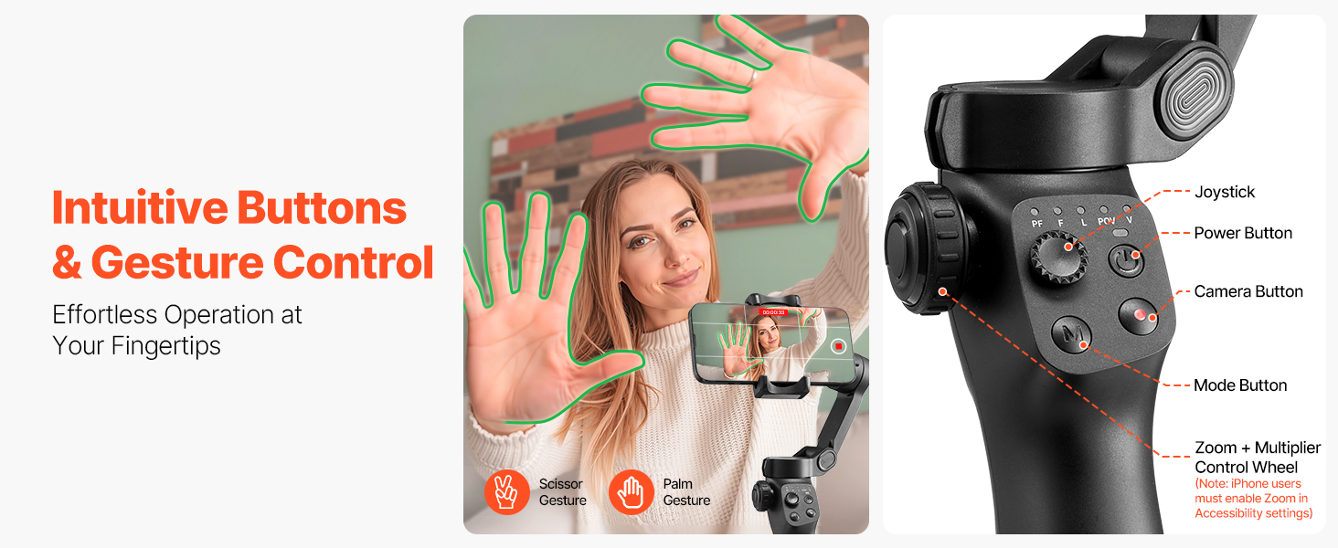 Vstavané tlačidlá a inteligentné ovládanie gestami vám dávajú moc do rúk - doslova. Prepínajte režimy alebo snímajte fotografie jednoduchým mávnutím. Žiadne ťukanie na obrazovku, žiadne šmátranie - len plynulé, intuitívne ovládanie na jednoduché snímanie s naším 3-osovým gimbalovým stabilizátorom pre smartfón.