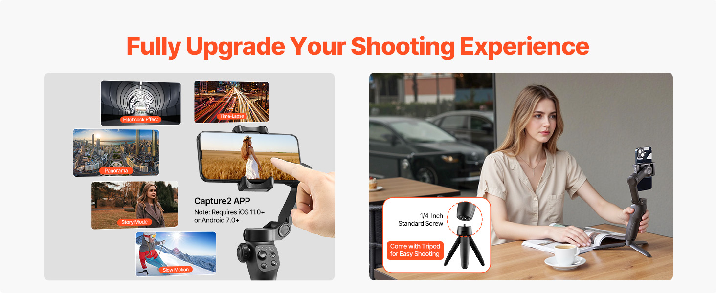 Spárujte tento stabilizátor pre telefón na nahrávanie videozáznamov s funkčne bohatou aplikáciou Capture2 a dodaným statívom na stabilizované snímanie bez použitia rúk. Vďaka kreatívnym režimom snímania a štandardnému 1/4-palcovému skrutkovaciemu držiaku vyrovná celý váš zážitok z filmovania.