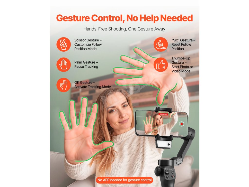 Vstavané tlačidlá a inteligentné ovládanie gestami vám dávajú moc do rúk - doslova. Prepínajte režimy alebo snímajte fotografie jednoduchým mávnutím. Žiadne ťukanie na obrazovku, žiadne šmátranie - len plynulé, intuitívne ovládanie na jednoduché snímanie s naším 3-osovým gimbalovým stabilizátorom pre smartfón.