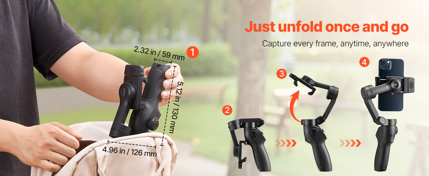 Je dostatočne kompaktný, aby sa zmestil do tašky alebo dokonca do vrecka - v zloženom stave meria len 5,12 x 2,32 x 4,96 palca. Či už ste na prechádzke mestom alebo na horskej túre, tento 3-osový ručný gimbalový stabilizátor je pripravený zachytiť každý nezabudnuteľný okamih.