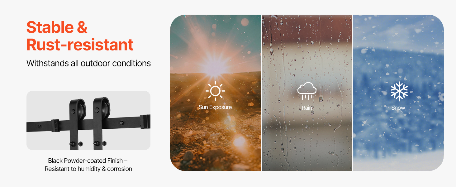 Táto súprava kovania pre posuvné stodolové dvere s odolnou čiernou práškovou povrchovou úpravou je odolná proti vlhkosti, hrdzi a je skonštruovaná tak, aby zvládla akékoľvek počasie - dážď, slnko alebo sneh. Vďaka nej budú vaše dvere vyzerať skvele bez potreby neustálej údržby.
