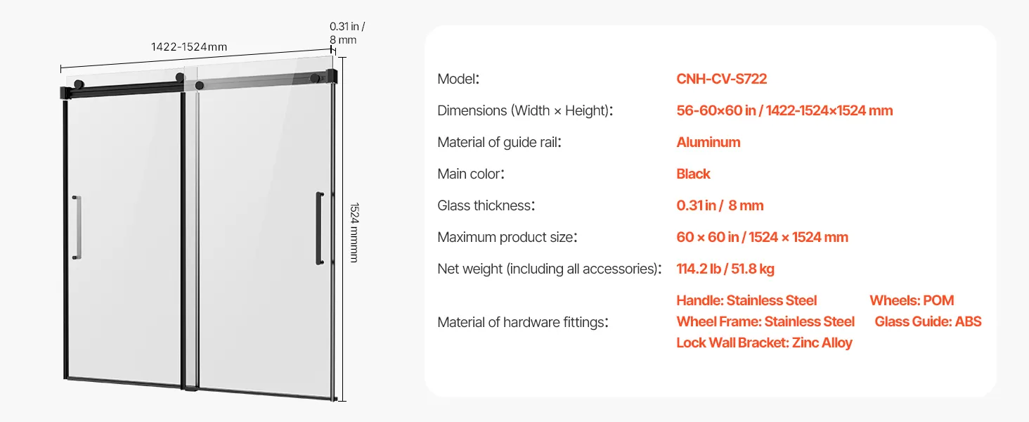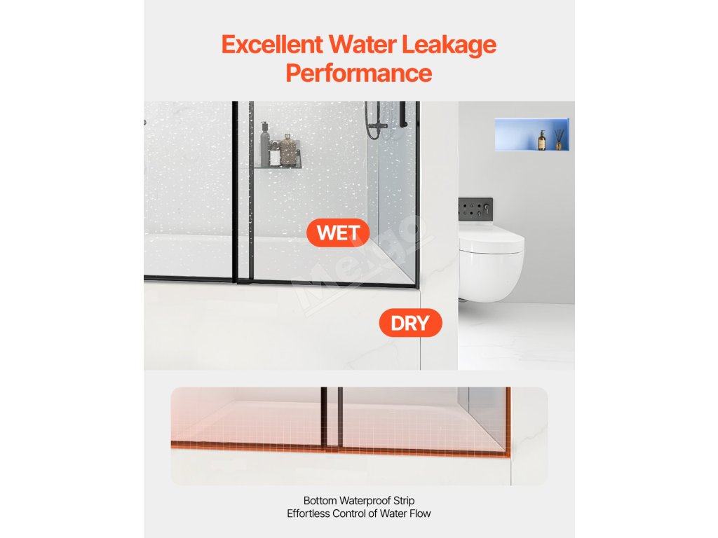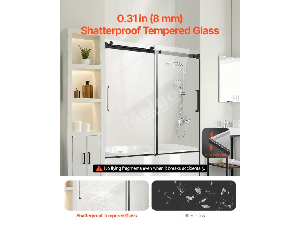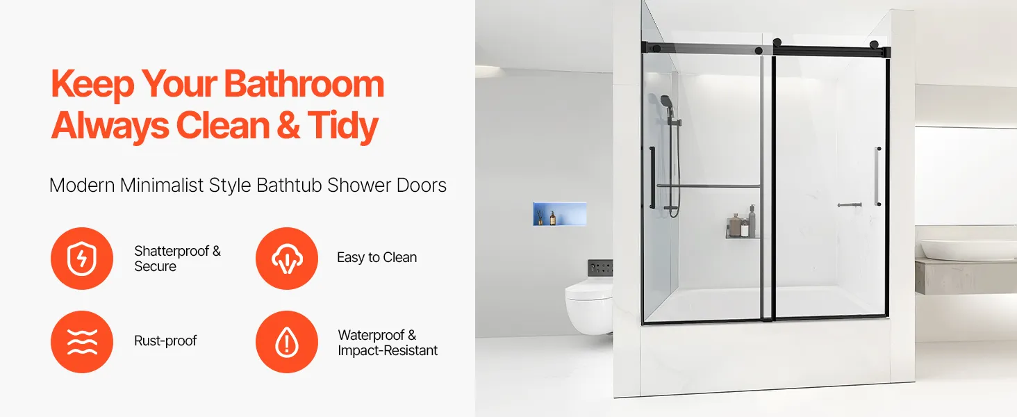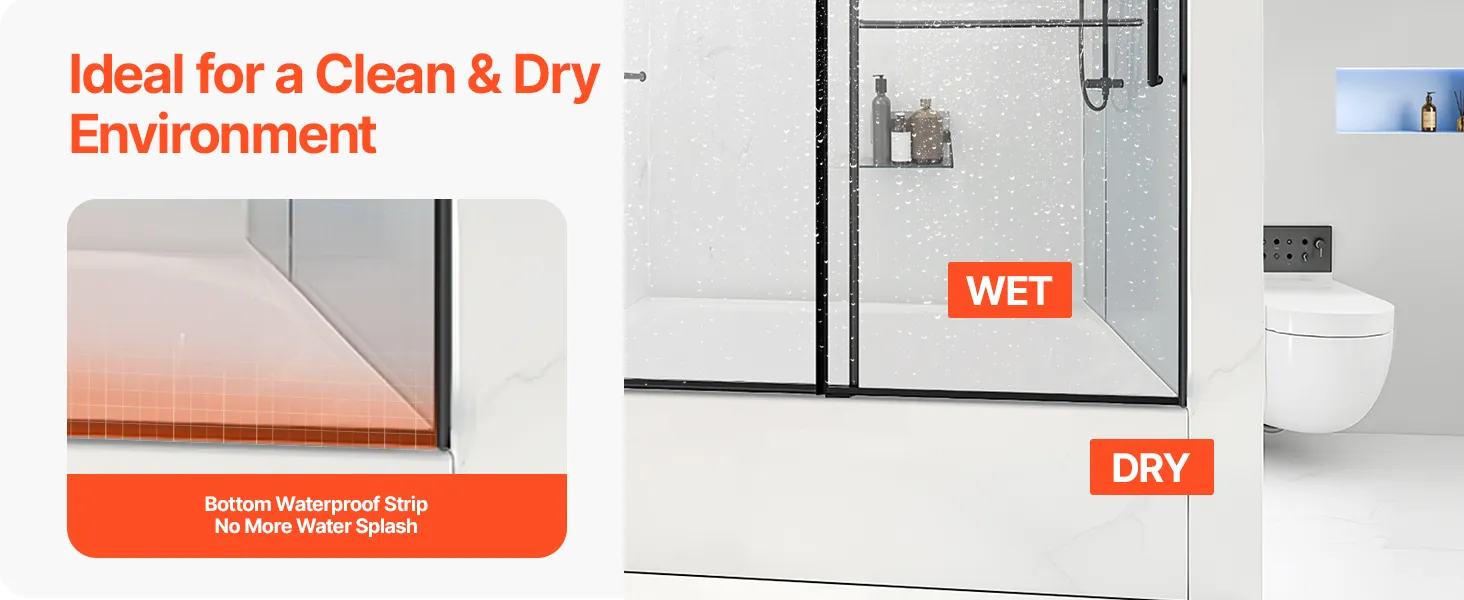 Tieto bezrámové posuvné vaňové dvere bez námahy doplnia akýkoľvek moderný kúpeľňový dekor. Jeho čisté línie a jednoduchá, ale elegantná estetika vytvárajú priestrannú a pokojnú atmosféru a zlepšujú celkový vzhľad vášho kúpacieho priestoru.