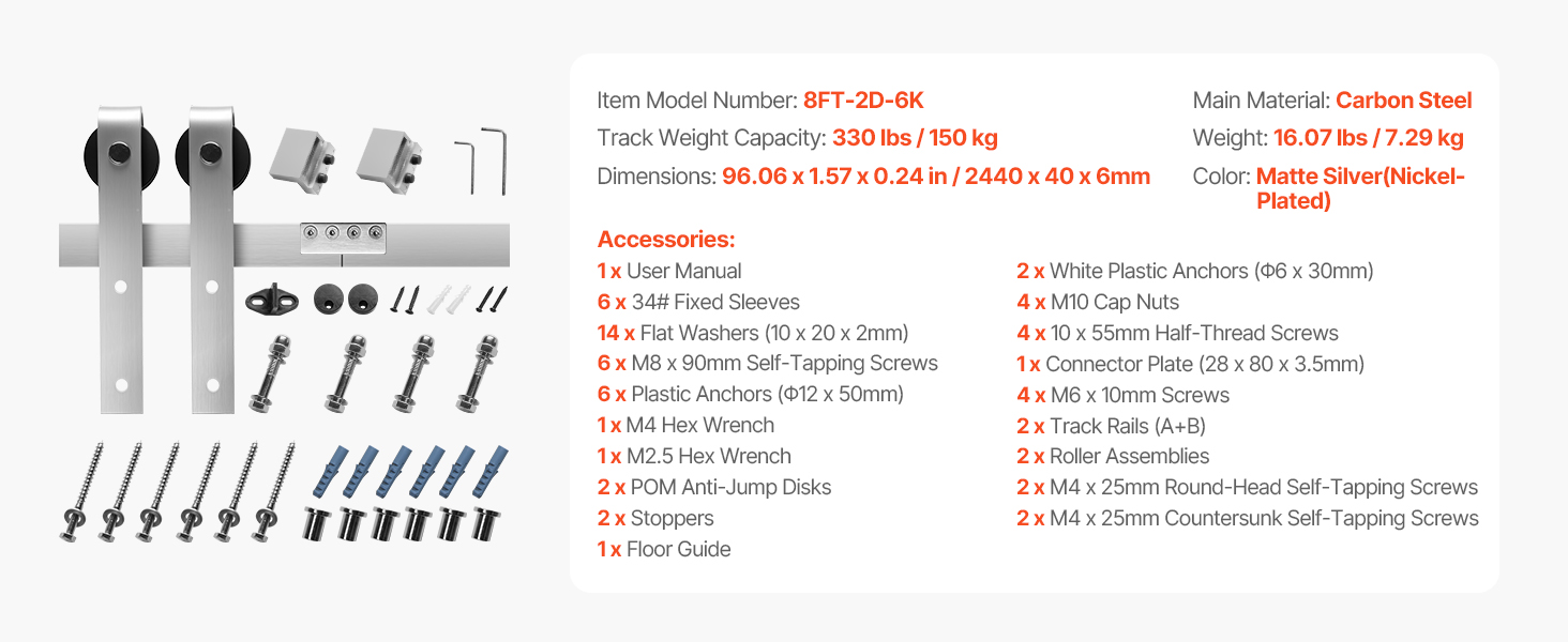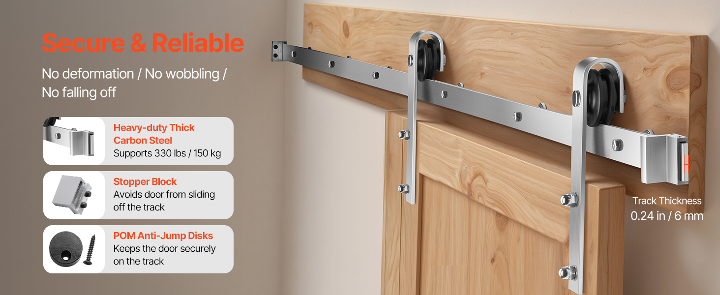 Táto stodolová dverová koľajnica, vyrobená z hrubej a odolnej uhlíkovej ocele, podopiera vaše dvere bez toho, aby sa ohýbala alebo deformovala. Vďaka limitným blokom a POM dielikom proti skákaniu sa nemusíte obávať, že by sa dvere zošmykli alebo poskakovali - váš priestor bude bezpečný!