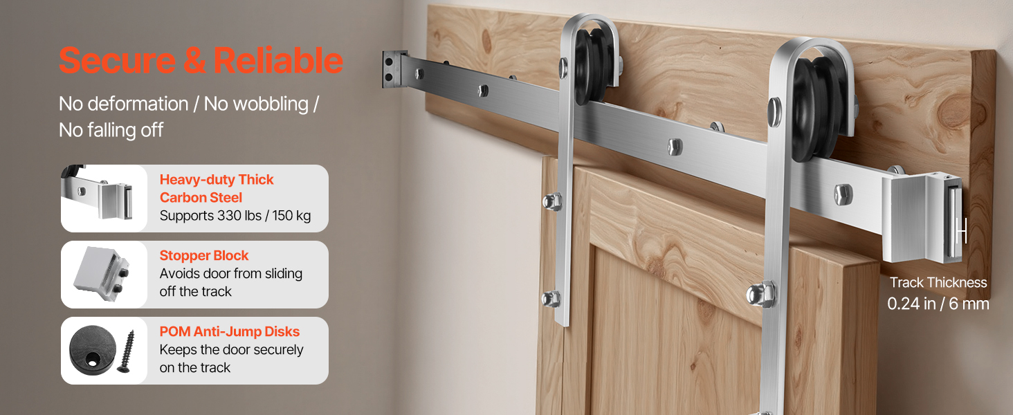 Táto stodolová dverová koľajnica, vyrobená z hrubej a odolnej uhlíkovej ocele, podopiera vaše dvere bez toho, aby sa ohýbala alebo deformovala. Vďaka limitným blokom a POM dielikom proti skákaniu sa nemusíte obávať, že by sa dvere zošmykli alebo poskakovali - váš priestor bude bezpečný!