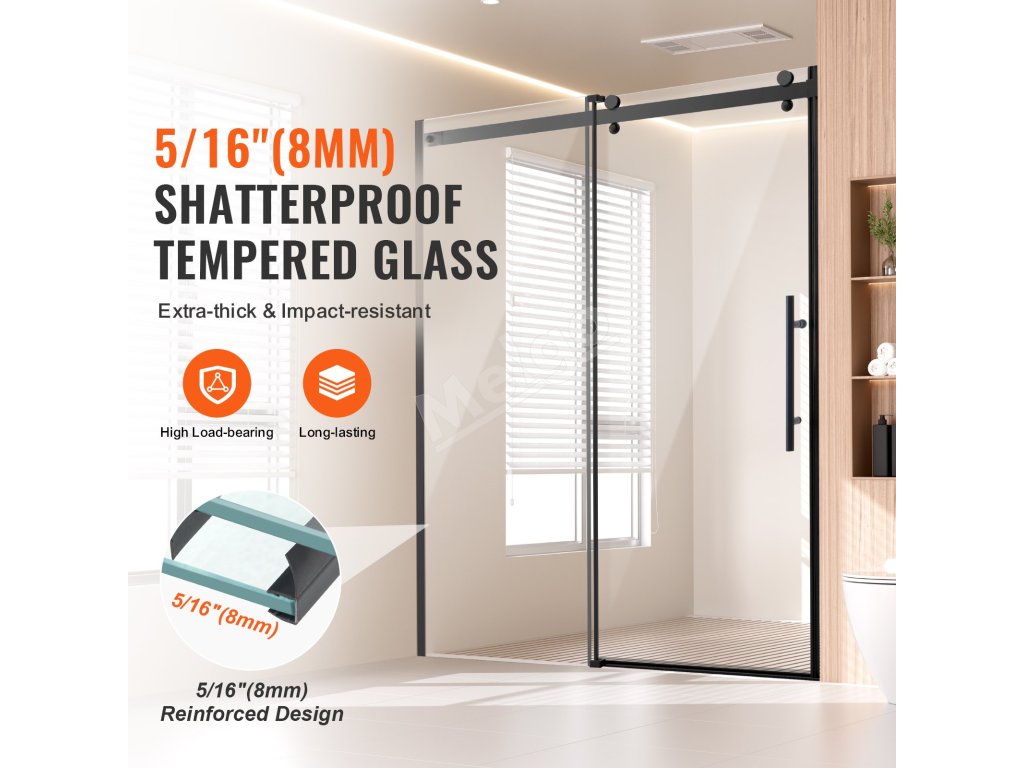 Tieto bezrámové sprchové dvere používajú tvrdené sklo s hrúbkou 5/16" (8 mm), ktoré je odolné voči korózii a trvácne. Sklenené dvere sú doplnené indikačnými značkami pre pevné a posuvné dvere, čo vám umožňuje voľne nastaviť smer inštalácie podľa vlastných preferencií.