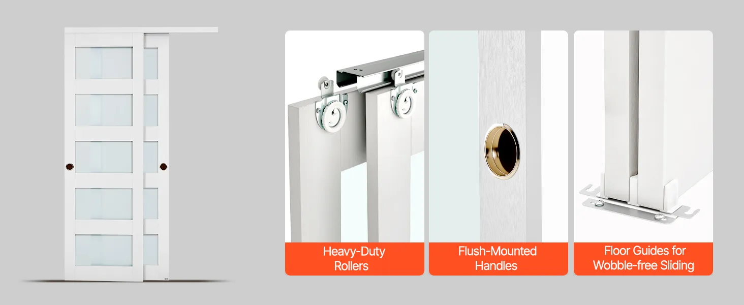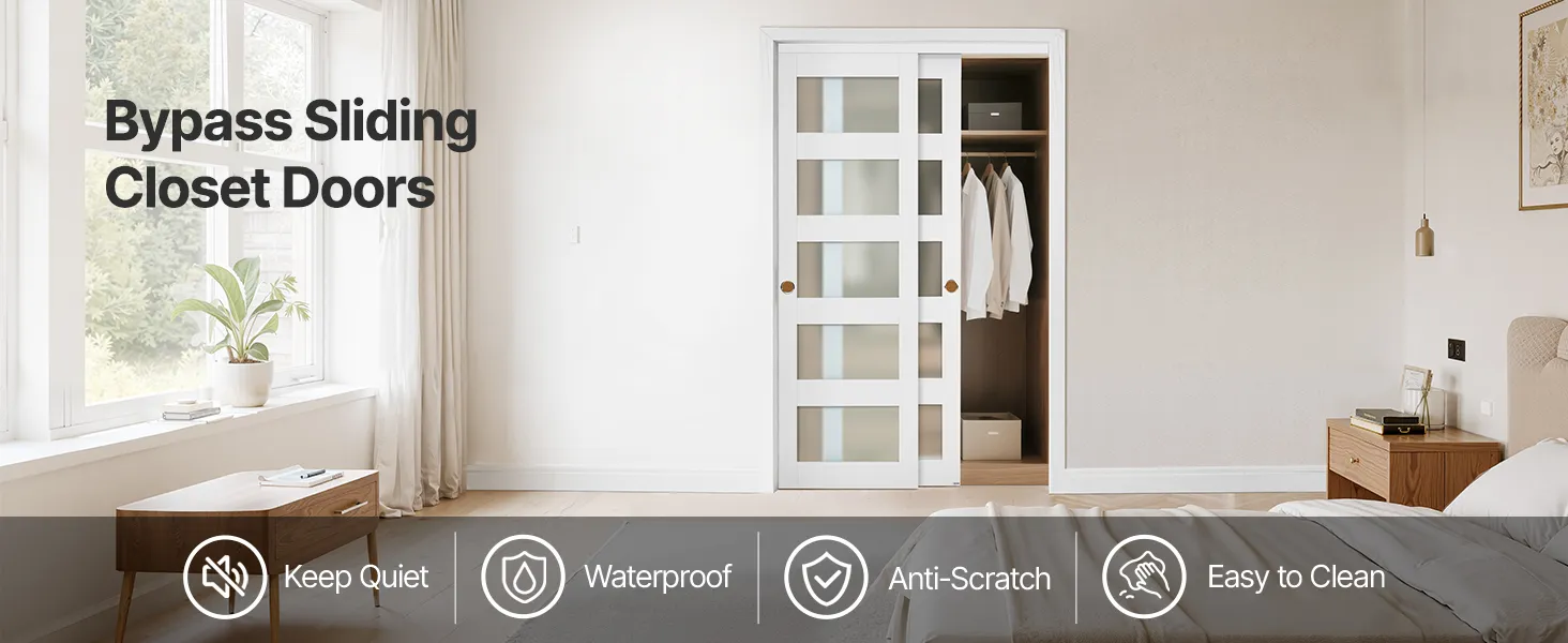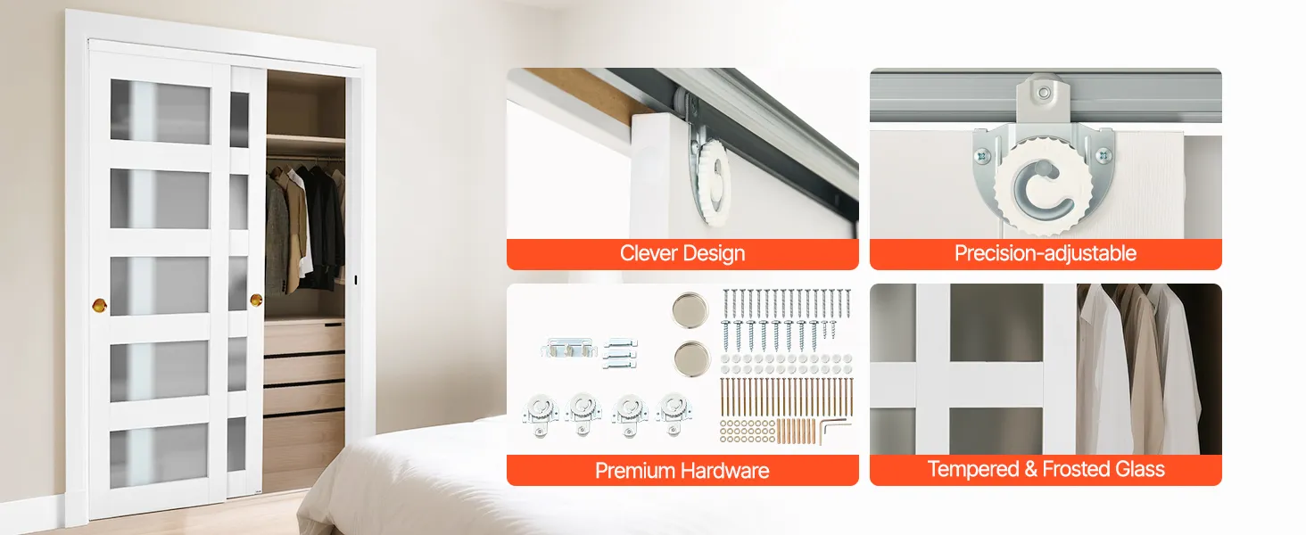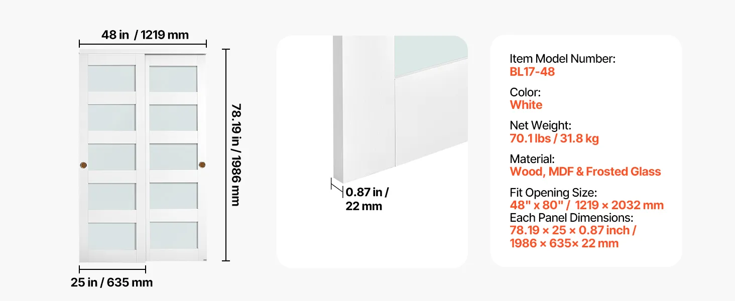 Vďaka odolnému drevenému rámu, vodeodolnému povrchu a matnému tvrdenému sklu 5-Lite poskytujú naše posuvné dvere do skrine plynulé posúvanie a zároveň šetria miesto. Rozmery každého dverného panelu: 635 mm (Š) x 1986 mm (V), hrúbka: 22 mm. Hodí sa na otvory dverí s rozmermi 1219 x 2032 mm.