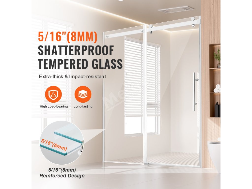 Tieto bezrámové sprchové dvere používajú tvrdené sklo s hrúbkou 5/16" (8 mm), ktoré je odolné voči korózii a trvácne. Sklenené dvere sú doplnené indikačnými značkami pre pevné a posuvné dvere, čo vám umožňuje voľne nastaviť smer inštalácie podľa vlastných preferencií.