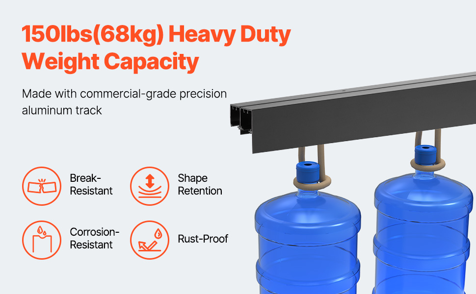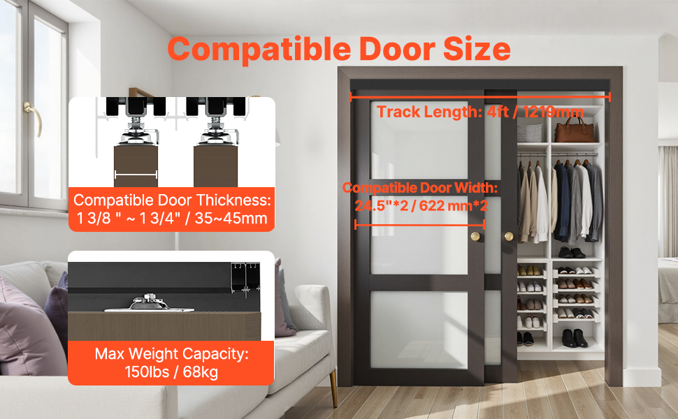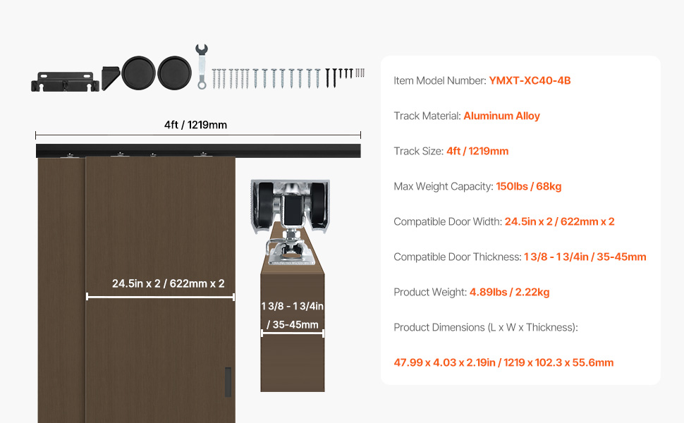 Táto súprava obchádzkového dverového kovania s dĺžkou 4 stôp je vhodná pre dverové panely s hrúbkou od 1 3/8" do 1 3/4" a šírkou 24,5" x 2. Podporuje maximálnu hmotnosť 150 kg, čo vám umožňuje vybrať si správnu veľkosť podľa vašich potrieb.