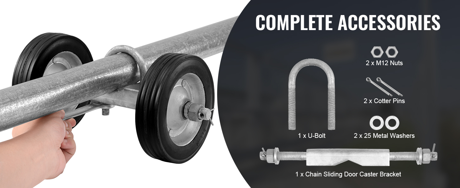 Táto súprava posuvných dverí s ťažkou reťazou je vybavená odolnými oceľovými a gumovými kolieskami, ktoré unesú až 600 kg. Zúbkovaný dizajn zlepšuje priľnavosť a stabilitu a zabezpečuje hladký chod. Súprava je kompatibilná s rôznymi rámami a koľajnicami s jednoduchou inštaláciou.