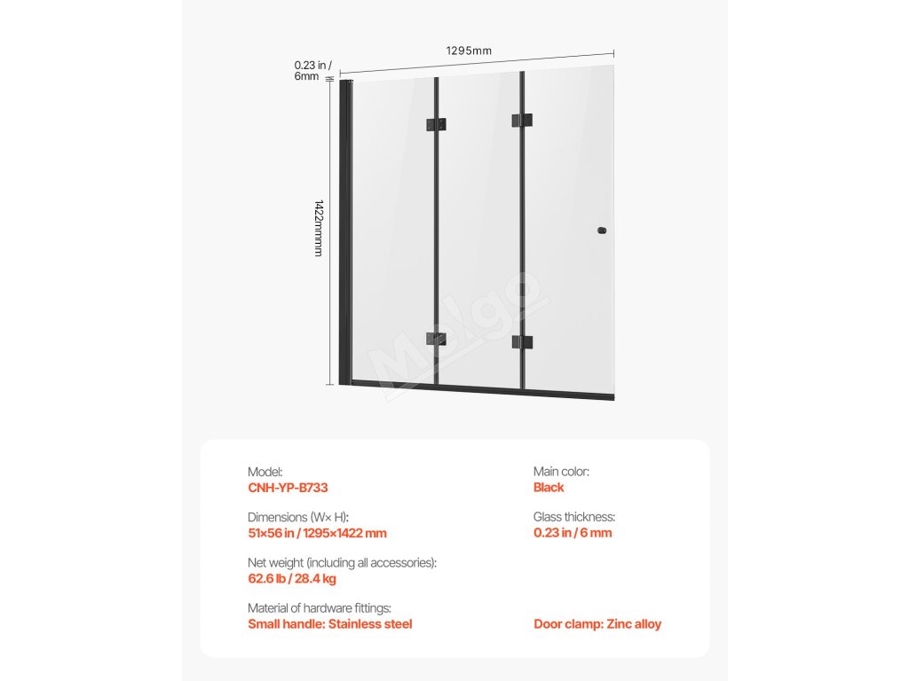Sklenené bezrámové dvere na vaňu 51×56" 1/4 in tvrdené čierne