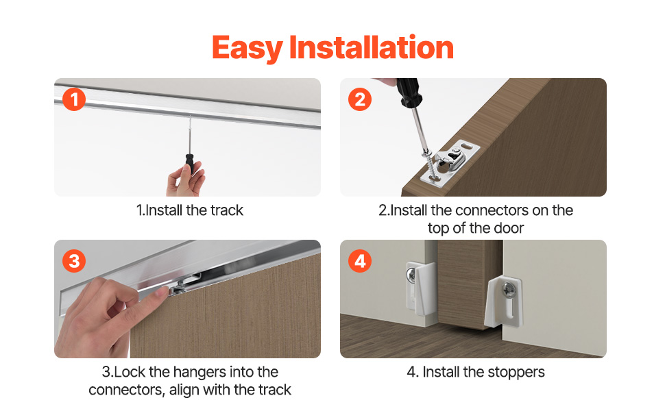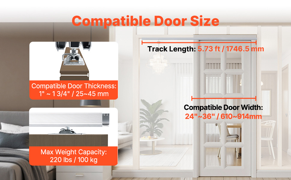 Táto súprava kovania pre 6ft vreckové dvere je vhodná pre dvere s hrúbkou od 1" do 1 3/4" a šírkou od 24" do 36" s maximálnou nosnosťou 220 kg. Môžete si vybrať veľkosť, ktorá vyhovuje vašim potrebám.