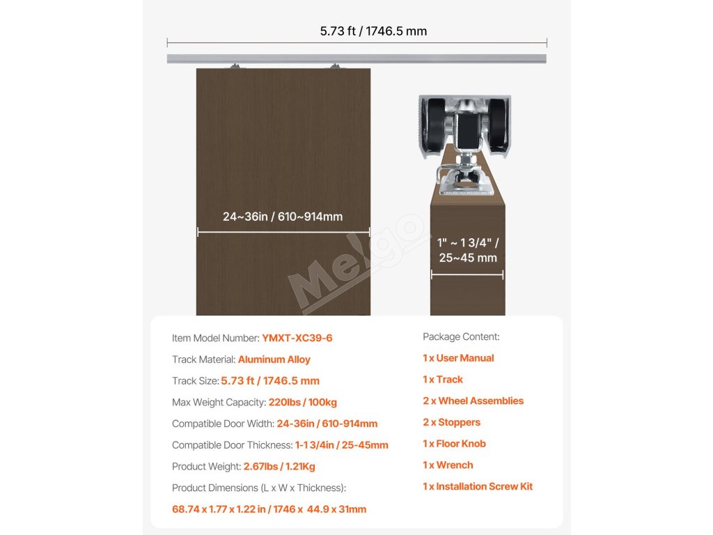 Táto súprava kovania pre 6ft vreckové dvere je vhodná pre dvere s hrúbkou od 1" do 1 3/4" a šírkou od 24" do 36" s maximálnou nosnosťou 220 kg. Môžete si vybrať veľkosť, ktorá vyhovuje vašim potrebám.