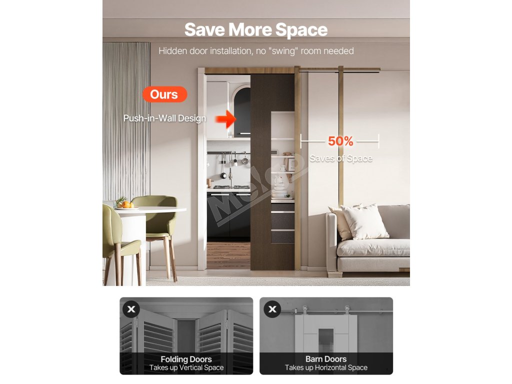 Konštrukcia so zvýšenou koľajnicou umožňuje flexibilné a plynulé otáčanie. Súpravu rámu vreckových dverí možno skrátiť tak, aby sa prispôsobila vlastnej šírke otvoru.