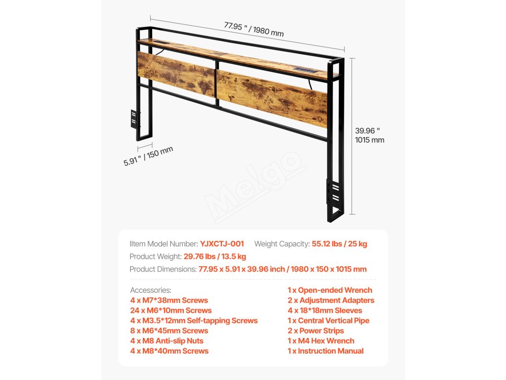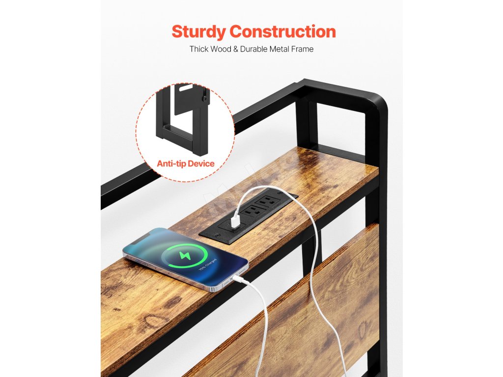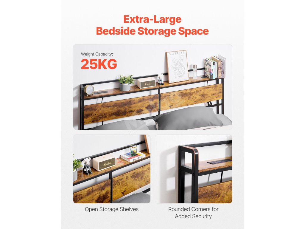 Vyrobené z vysokokvalitného dreva a pevného kovového rámu spolu s konštrukciou proti prevráteniu, ktorá zaručuje, že čelo postele zostane stabilné.