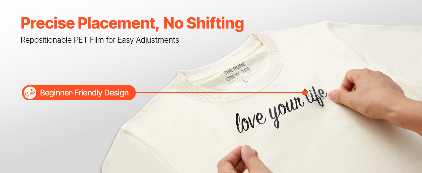 Vinyl HTV obsahuje lepivý PET podklad, ktorý priľne k odevom a umožňuje ich umiestnenie. Pred stlačením ho môžete manuálne upraviť, aby ste zaistili presné umiestnenie bez posunu dizajnu - nie je potrebné hádať.