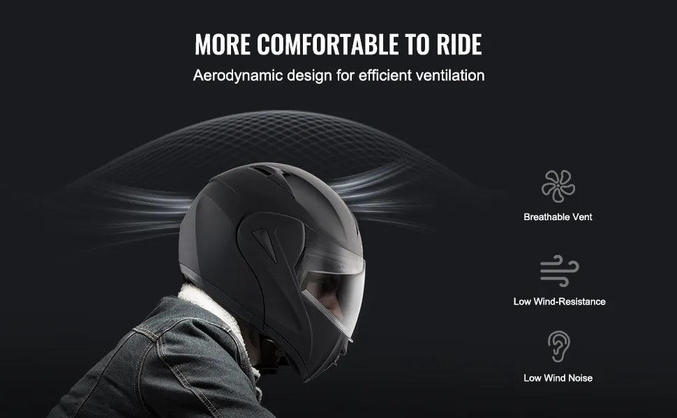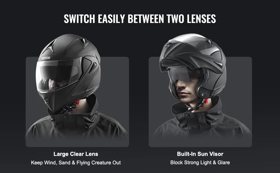 Uzavreté sklá na prilbe, vybavené priehľadnými sklami veľkých rozmerov, dokážu účinne blokovať vietor, piesok a lietajúce tvory. Vychutnajte si pohodlnú jazdu otvorením šošoviek.