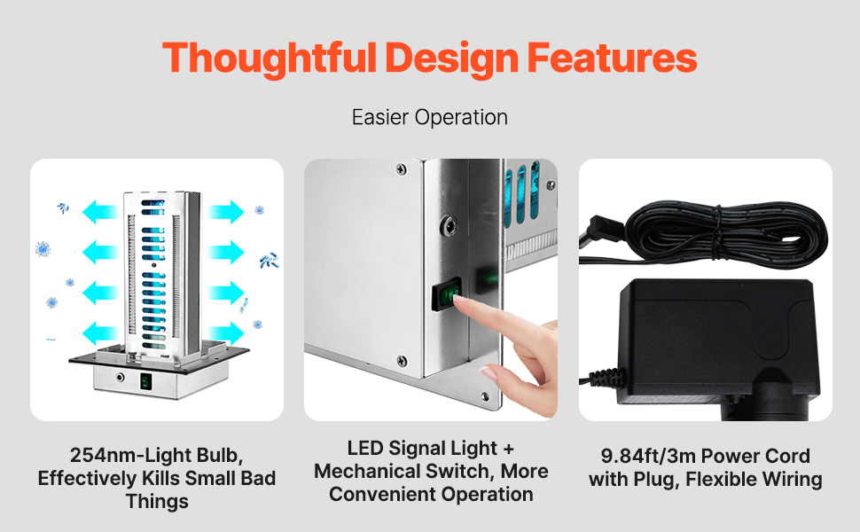 Náš čistič vzduchotechnických kanálov je vybavený mechanickým spínačom na jednoduché ovládanie. Indikátor LED jasne zobrazuje prevádzkový stav žiarovky. Dodáva sa s adaptérom, ktorý majiteľom domov umožňuje priame zapojenie do elektrickej siete pre väčšie pohodlie.