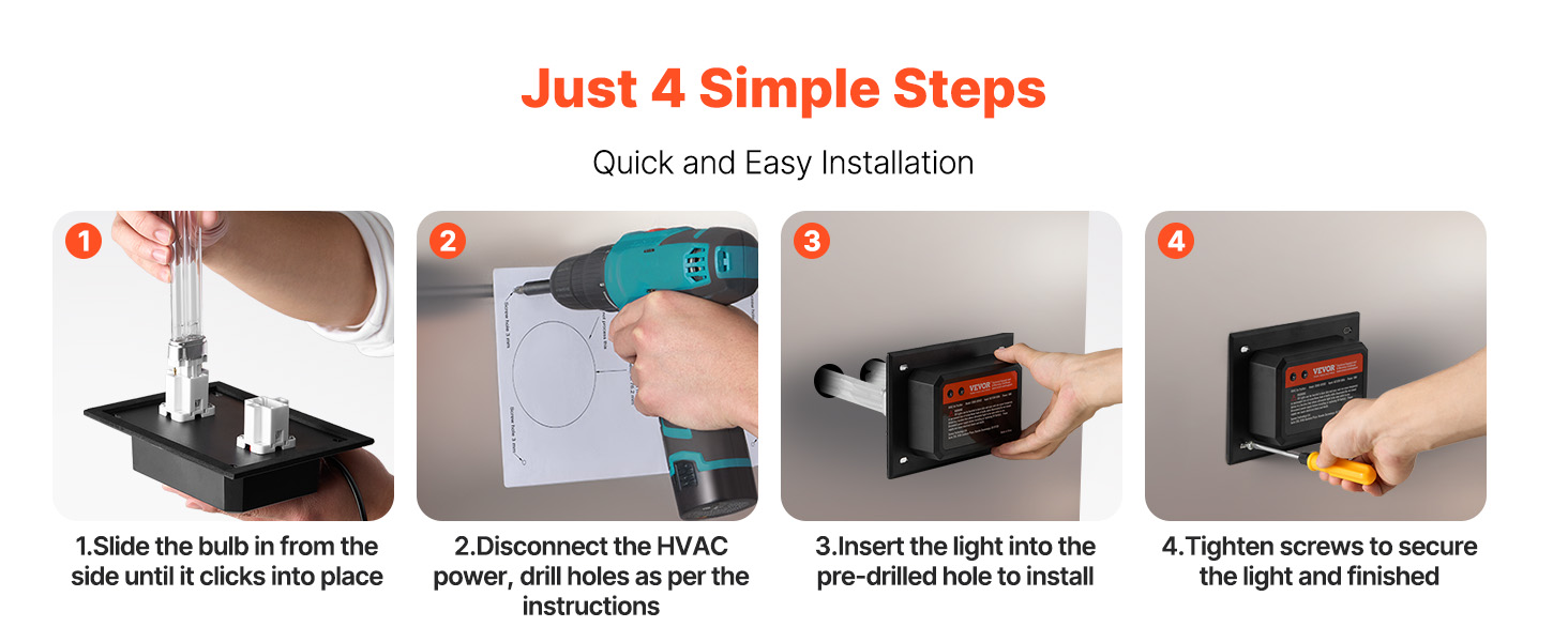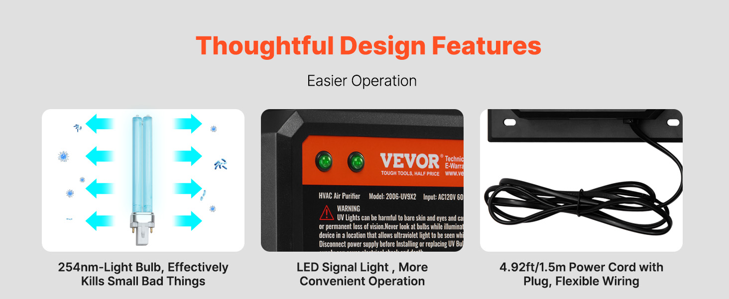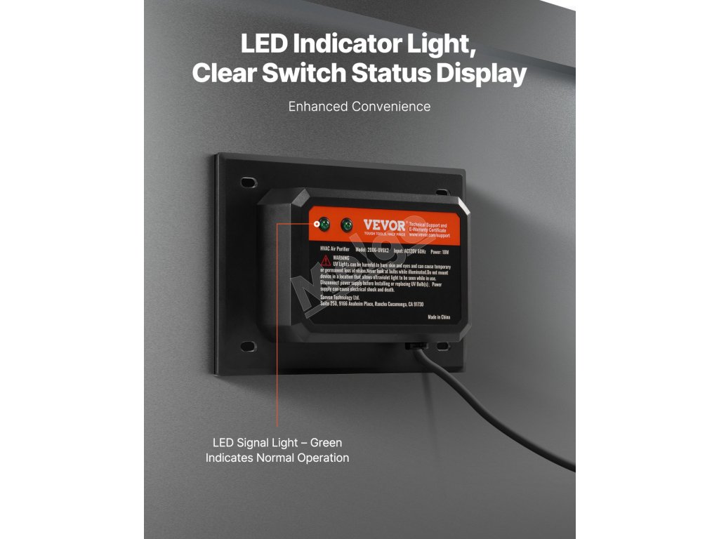 Náš čistič vzduchotechnických kanálov je vybavený mechanickým spínačom na jednoduché ovládanie. Indikátor LED jasne zobrazuje prevádzkový stav žiarovky UV-C a predĺžený napájací kábel umožňuje flexibilnú a pohodlnú inštaláciu. EPA Est. Číslo 94721-CHN-1