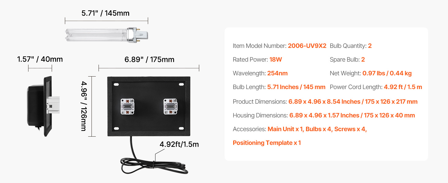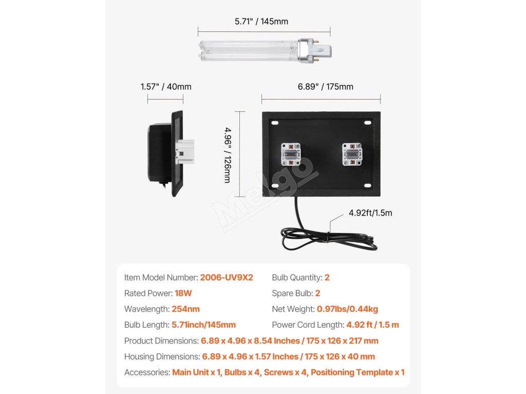 Lampa uv-c do vzduchotechniky 18W 7inch, 2 náhradné žiarovky