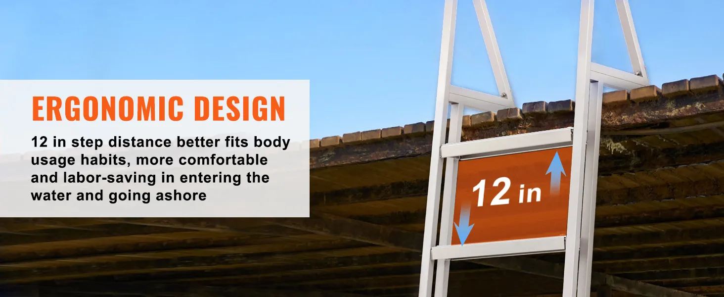 Široké stupne tohto rebríka majú šírku 4 palce. Sú vybavené protišmykovými gumovými rohožami. Táto konštrukcia zaručuje maximálnu stabilitu a bezpečnosť. Gumové rohože poskytujú bezpečné uchopenie aj za mokra. Je obzvlášť užitočná pre deti a starších ľudí. Neposuvnosť znižuje riziko nehôd. Je prospešná aj pre tých, ktorí pri lezení prenášajú predmety. Široké stupne uľahčujú výstup, čím znižujú únavu. Vďaka tejto konštrukcii je teda rebrík užívateľsky prívetivý pre všetky vekové kategórie. Môžete ho bez obáv používať pri rôznych vodných aktivitách.