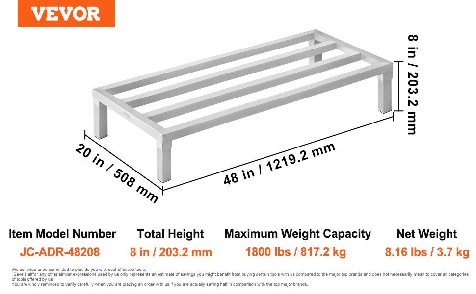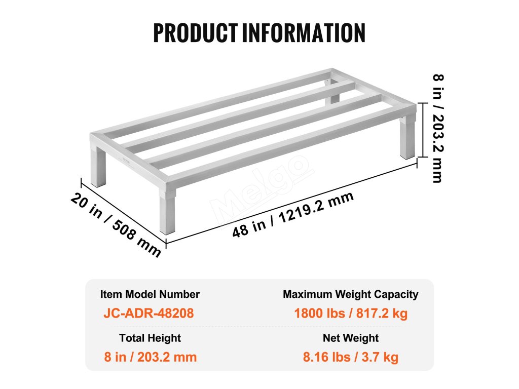 Hliníkový podlahový regál 48×20" 8" nad podlahou, 1800 lbs, zváraný