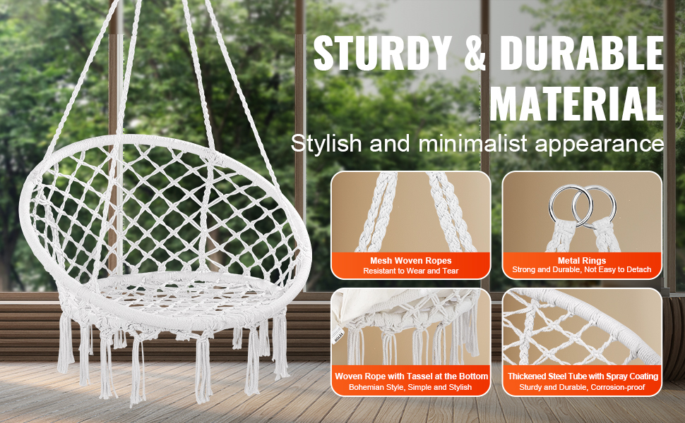 Toto závesné hojdacie kreslo vyrobené z tkaného sieťového lana a podpier z oceľových rúrok je pevné a stabilné, odolné voči zlomeniu alebo prevráteniu.