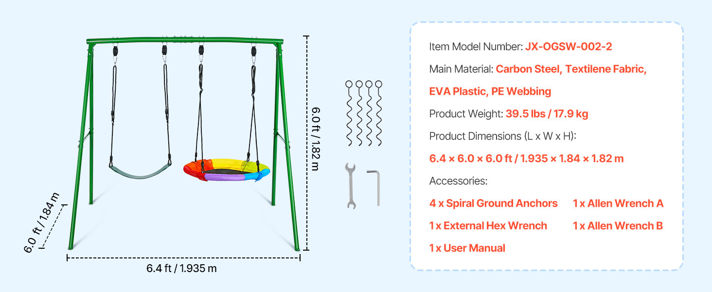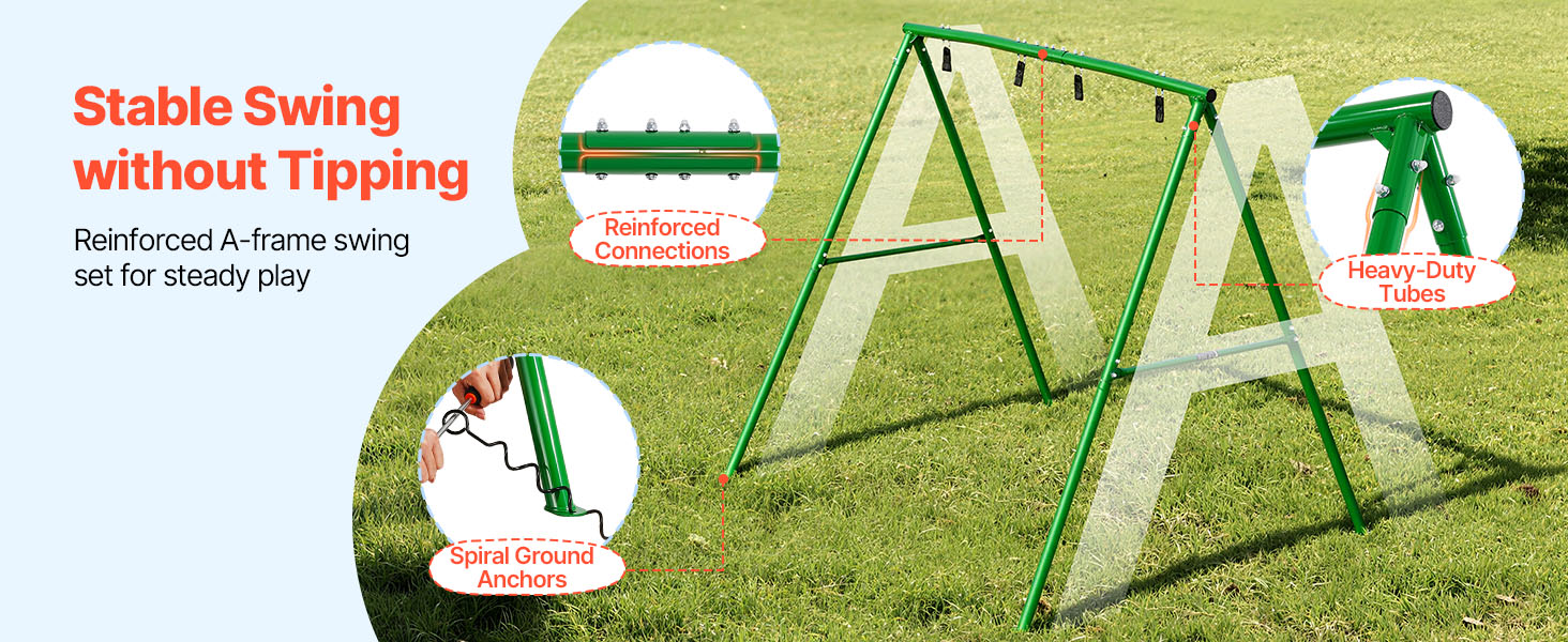 Oceľový rám v tvare písmena A so zosilnenými objímkami vytvára pevnú a stabilnú trojuholníkovú konštrukciu. Odolné rúrkové spoje zvyšujú celkovú pevnosť hojdačky, zatiaľ čo špirálové kotvy pevne upevňujú rám k zemi, čím pomáhajú minimalizovať pohyb počas hojdania.