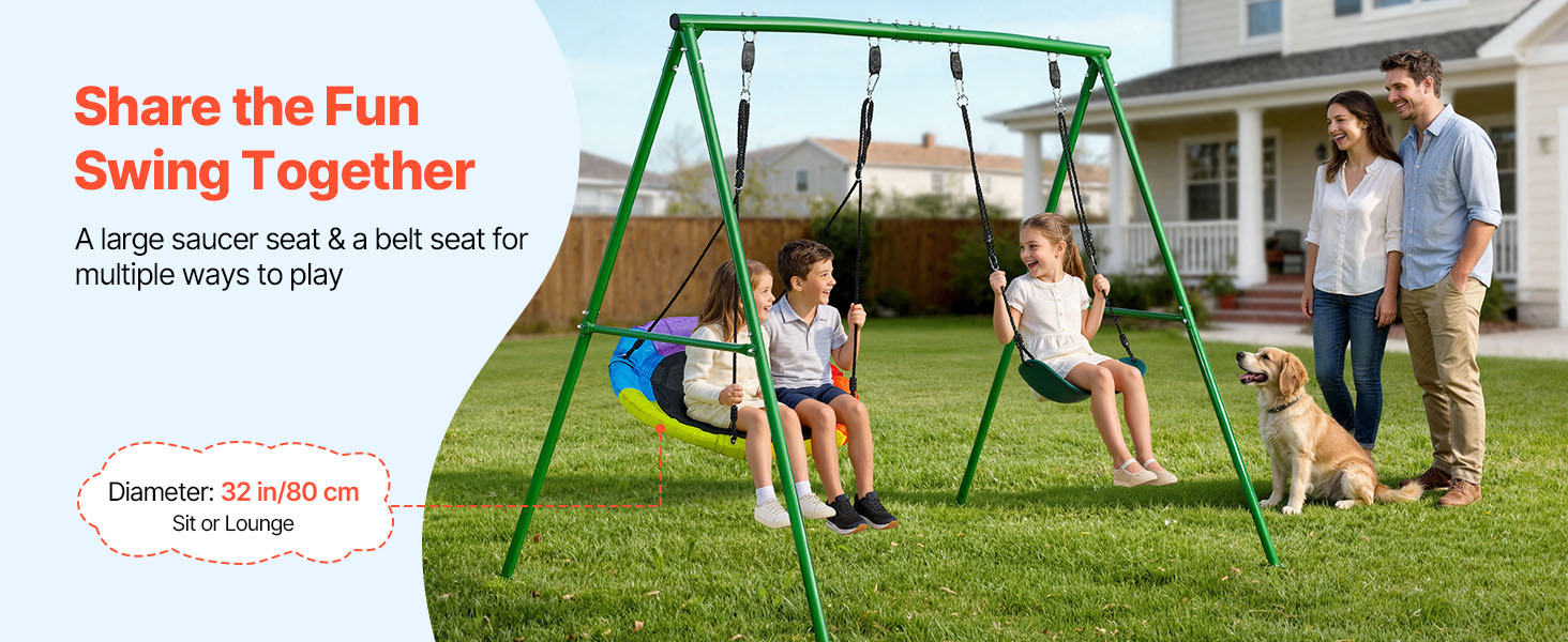 Táto hojdačka s podstavcom má dve sedadlá – veľkú okrúhlu hojdačku a hojdačku s pásom – čím vytvára flexibilné možnosti hry pre viacero detí, ktoré si môžu spolu užívať hojdanie.