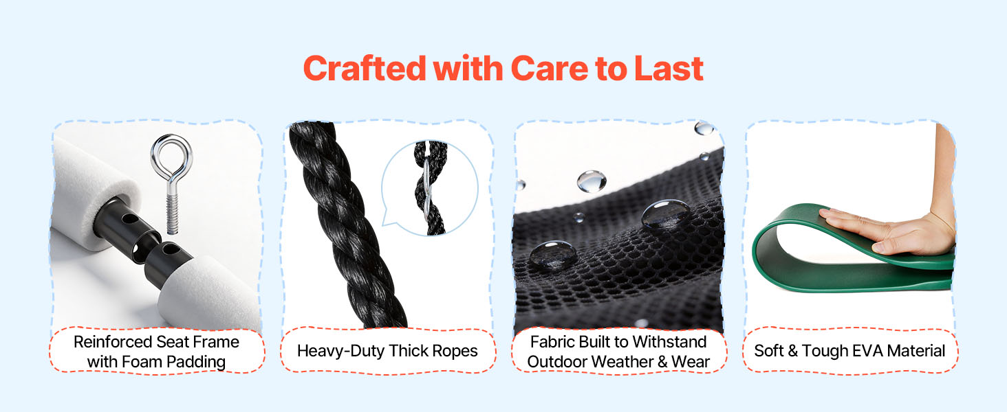 Vystužený rám sedadla s penovým poťahom zaisťuje rovnováhu medzi oporou a pohodlím. Materiál sedadla a pásu vydrží časté používanie. Vysoko odolné nastaviteľné laná poskytujú stabilnú oporu pre hojdačku s rámom.