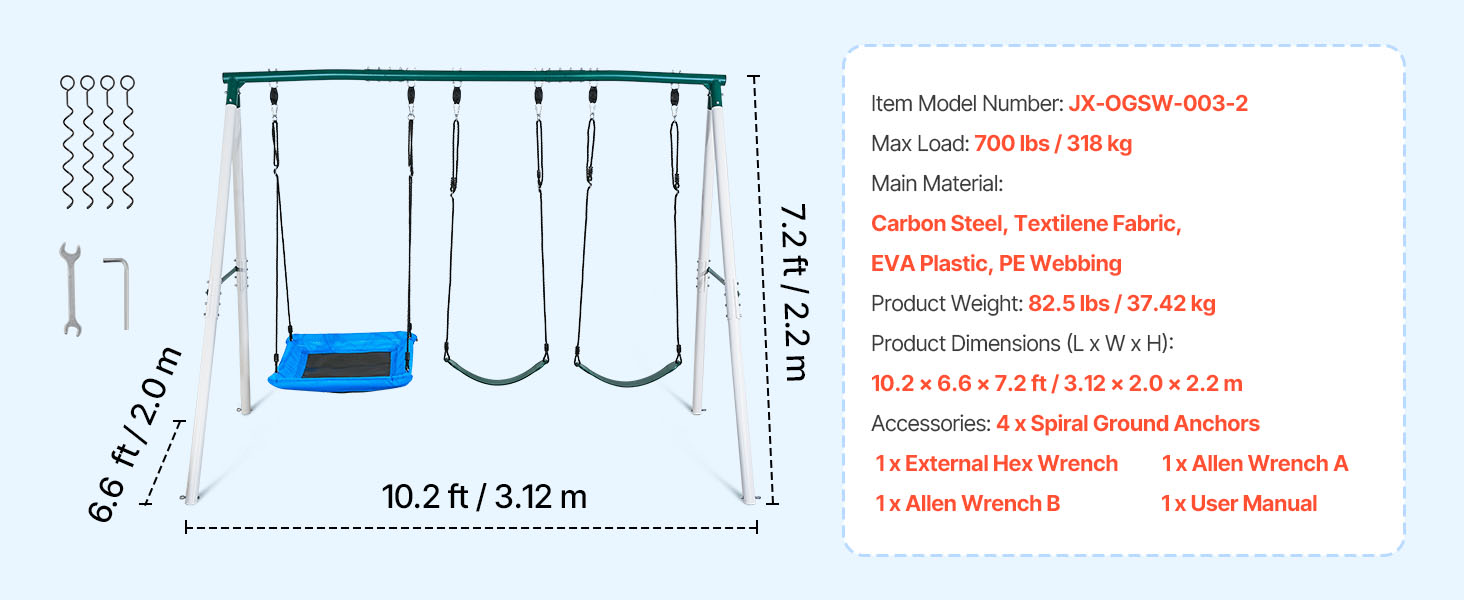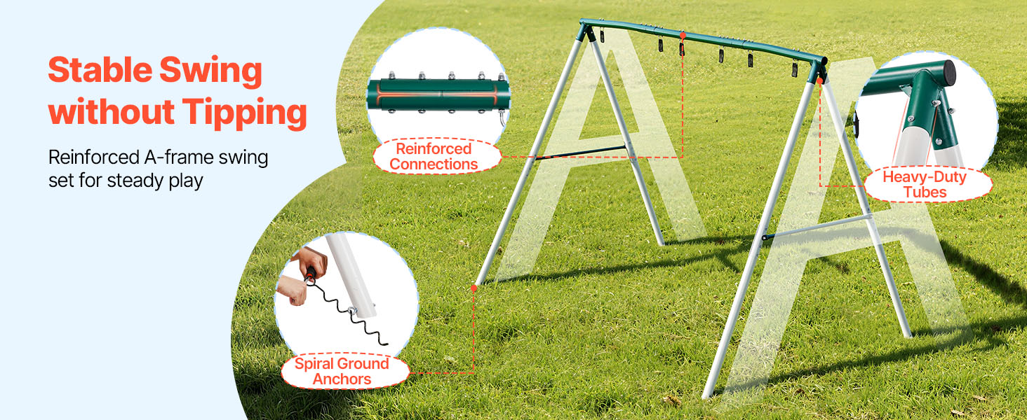 Oceľový rám v tvare písmena A so zosilnenými objímkami vytvára pevnú a stabilnú trojuholníkovú konštrukciu. Odolné rúrkové spoje zvyšujú celkovú pevnosť hojdačky, zatiaľ čo špirálové kotvy pevne upevňujú rám k zemi, čím pomáhajú minimalizovať pohyb počas hojdania.