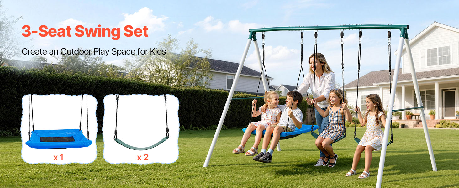 Táto hojdačka s podstavcom má tri sedadlá – veľkú štvorcovú hojdačku a dve hojdačky s pásom – čím vytvára flexibilné možnosti hry pre viac detí, ktoré si môžu spolu užívať hojdačku.