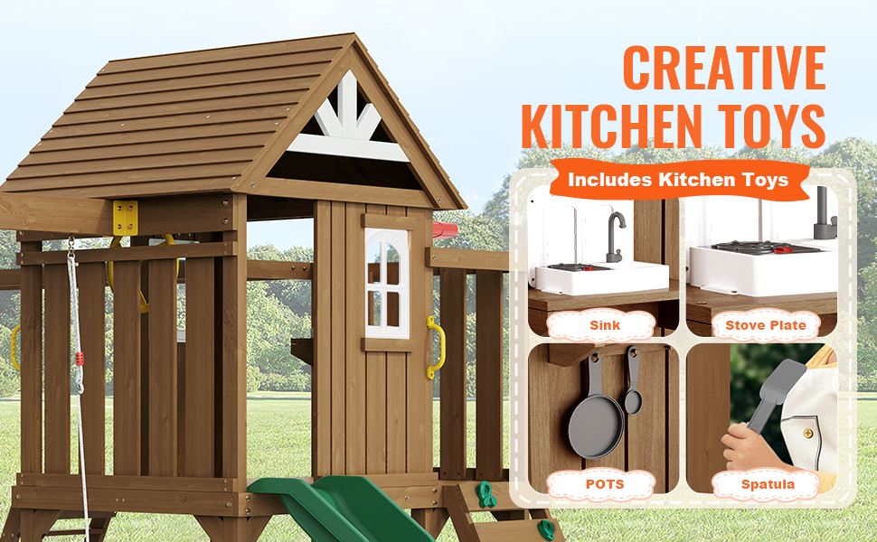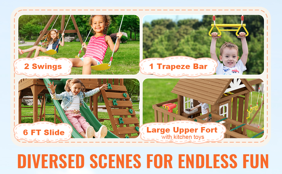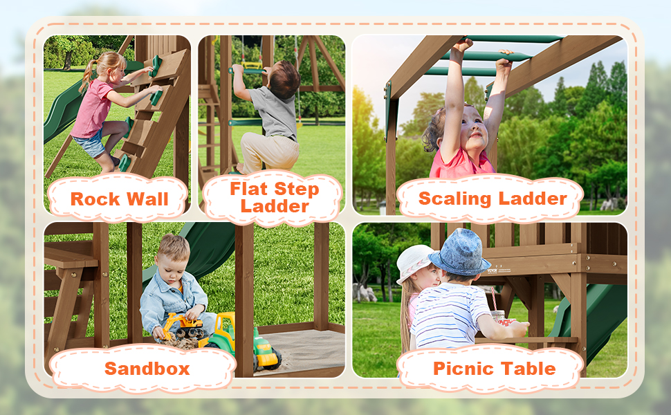 Táto hojdacia súprava 10 v 1 obsahuje dve nastaviteľné hojdačky, hrazdu, 6ft šmýkačku, pevnosť s kompletnými hračkami do kuchyne, plochu na pieskovisko, skalnú stenu, plochý schodiskový rebrík, šplhací rebrík a piknikový stôl.