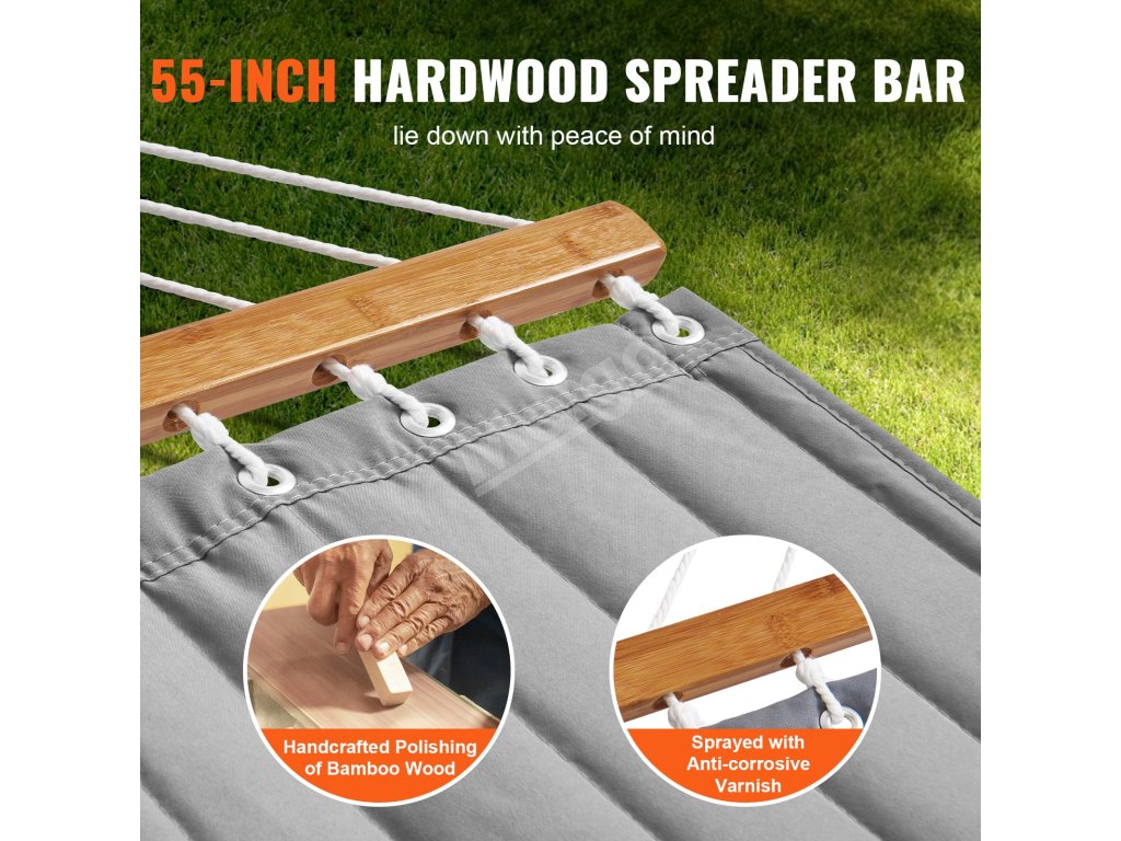 Rozpínacie tyče z tvrdého dreva s rozmermi 55 palcov zabezpečujú rovnomerné rozloženie hmotnosti, udržujú stabilitu a zabraňujú prevráteniu. Sú starostlivo vyleštené a lakované pre dlhú životnosť. Okrem toho je každý otvor na lano vyhladený, aby sa minimalizovalo trenie a predĺžila životnosť lana.