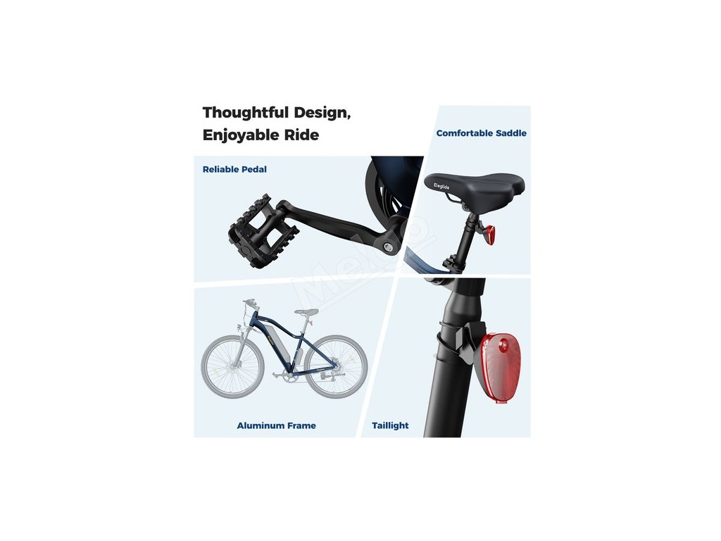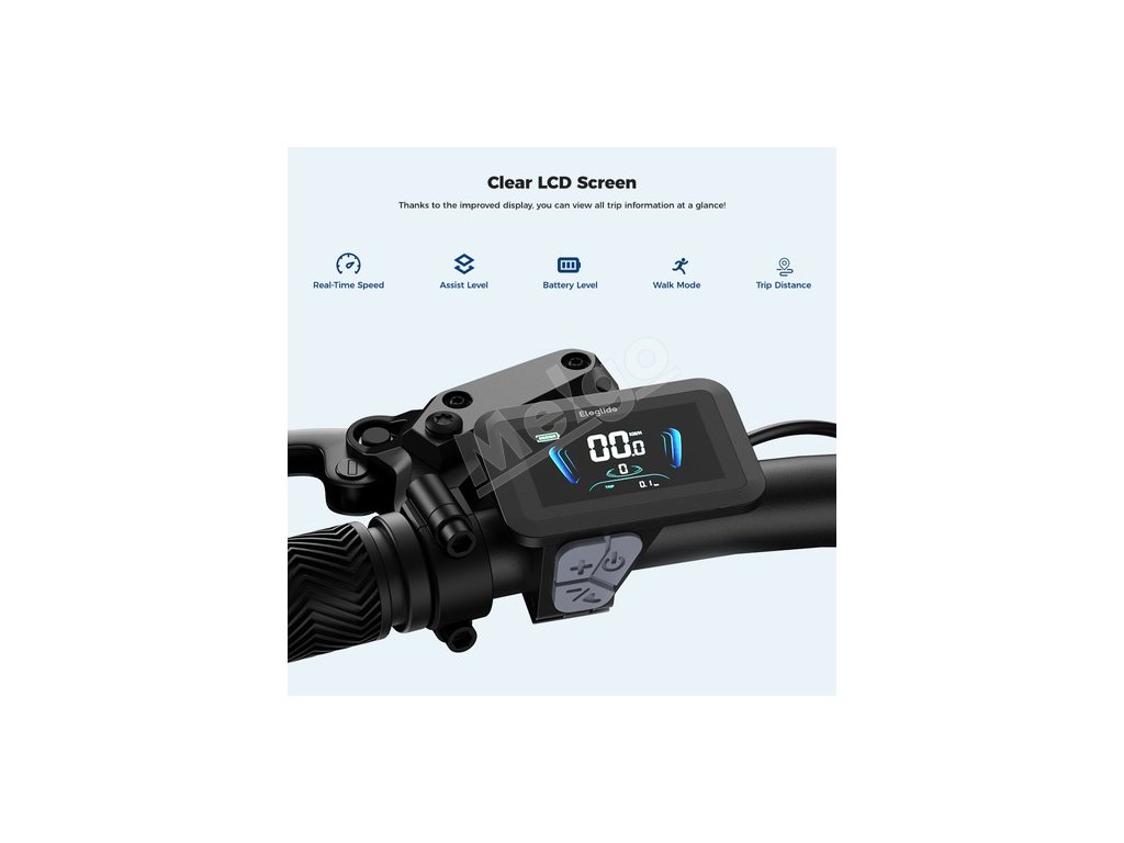 Vybavený prednými svetlometmi a zadnými svetlami s certifikáciou EU StVZO tento elektrobicykel zaisťuje vynikajúcu viditeľnosť a bezpečnosť za zhoršených svetelných podmienok. Displej LCD poskytuje jasné a ľahko čitateľné informácie, vďaka čomu budete mať neustále informácie o svojej jazde. Okrem toho môžete bicykel ovládať pomocou aplikácie Eleglide vo svojom telefóne. Táto inteligentná aplikácia vám umožňuje aktivovať ďalšie funkcie, ako napríklad uzamknutie bicykla, nastavenie hesla a nastavenie časového limitu na obrazovke, čo vám pomôže maximálne využiť vašu jazdu.