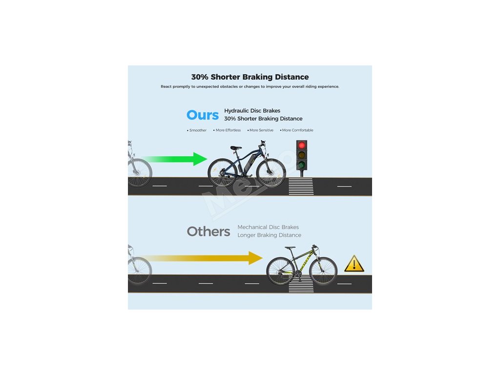 Bicykel Mopride 3 je vybavený hydraulickými kotúčovými brzdami, ktoré poskytujú silný a stabilný brzdný výkon, čo vedie k hladkému a účinnému zastaveniu. Brzdná dráha je o 30 % kratšia ako pri mechanických kotúčových brzdách, takže jazda v teréne je bezpečnejšia a spoľahlivejšia.