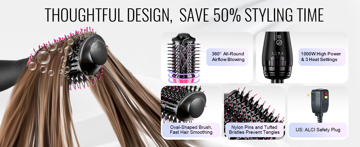 Vychutnajte si hladké účesy bez námahy vďaka nášmu 360° priestorovému prúdeniu vzduchu, ktoré dodáva rovnomerné teplo na zníženie krepovatenia. Oválna kefa s priemerom 2,56 palca (65 mm) je vybavená nylonovými kolíkmi a tupírovanými štetinami, ktoré zabraňujú zamotávaniu vlasov.