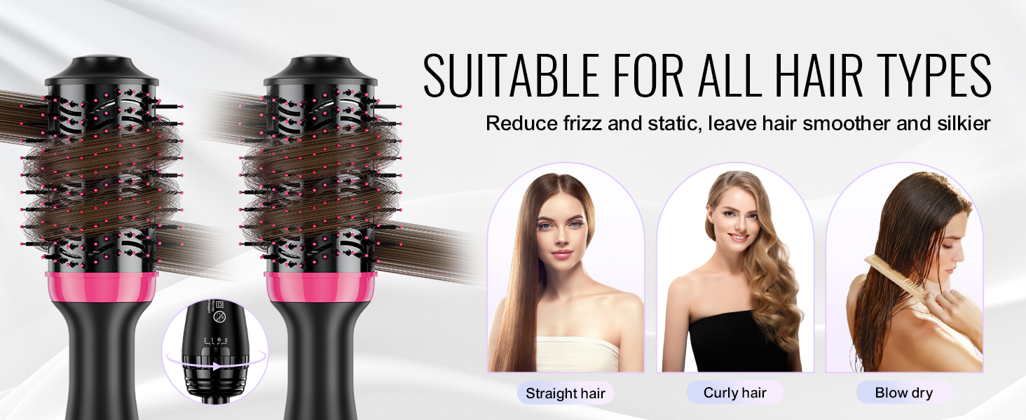 Naša multifunkčná teplovzdušná stylingová kefa je ideálna pre všetky typy vlasov, bez námahy si poradí s rovnými, kučeravými aj sušiacimi potrebami. Vďaka 3 nastaviteľným nastaveniam (chladné, nízke a vysoké) ju môžete ľahko prispôsobiť rôznym potrebám stylingu a ľahko dosiahnuť svoj ideálny vzhľad.