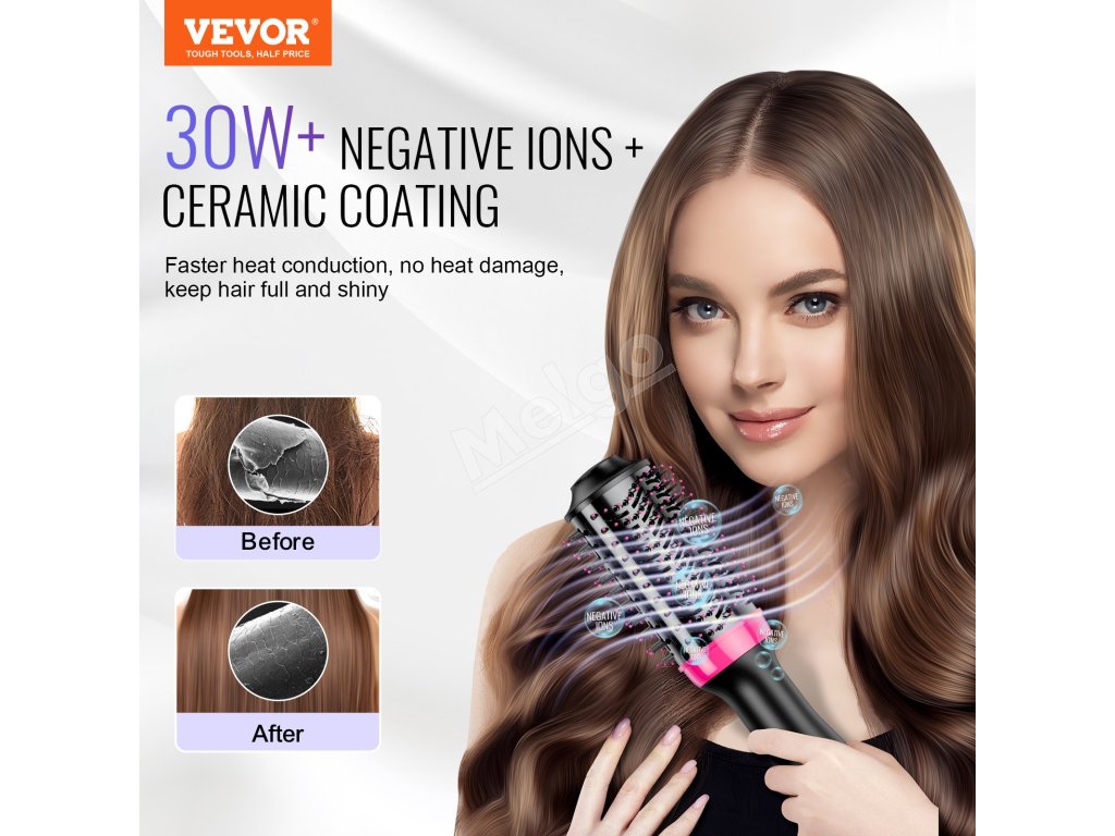 VEVOR kefa na sušenie vlasov 4 v 1: váš stylingový kúzelník! Bez námahy dosiahnete sušenie, kulmovanie, narovnávanie a zväčšovanie objemu, aby ste splnili všetky potreby účesu. Vďaka pokročilému keramickému povlaku a 30 W+ záporným iónom účinne znižuje tepelné poškodenie a zároveň uzamyká vlhkosť pre hladšie a zdravšie vlasy.