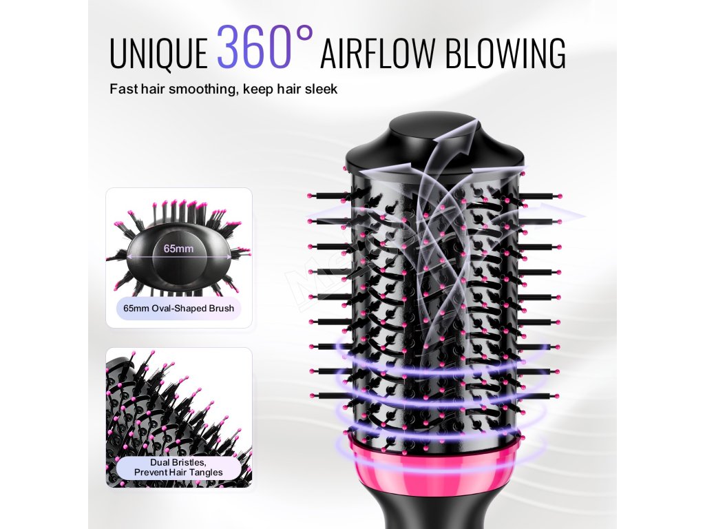 Vychutnajte si hladké účesy bez námahy vďaka nášmu 360° priestorovému prúdeniu vzduchu, ktoré dodáva rovnomerné teplo na zníženie krepovatenia. Oválna kefa s priemerom 2,56 palca (65 mm) je vybavená nylonovými kolíkmi a tupírovanými štetinami, ktoré zabraňujú zamotávaniu vlasov.