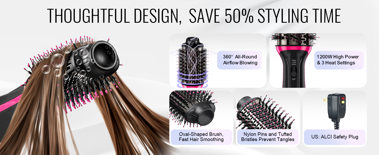 Vychutnajte si hladké účesy bez námahy vďaka nášmu 360° priestorovému prúdeniu vzduchu, ktoré dodáva rovnomerné teplo na zníženie krepovatenia. Oválna kefa s priemerom 2,56 palca (65 mm) je vybavená nylonovými kolíkmi a tupírovanými štetinami, ktoré zabraňujú zamotávaniu vlasov.