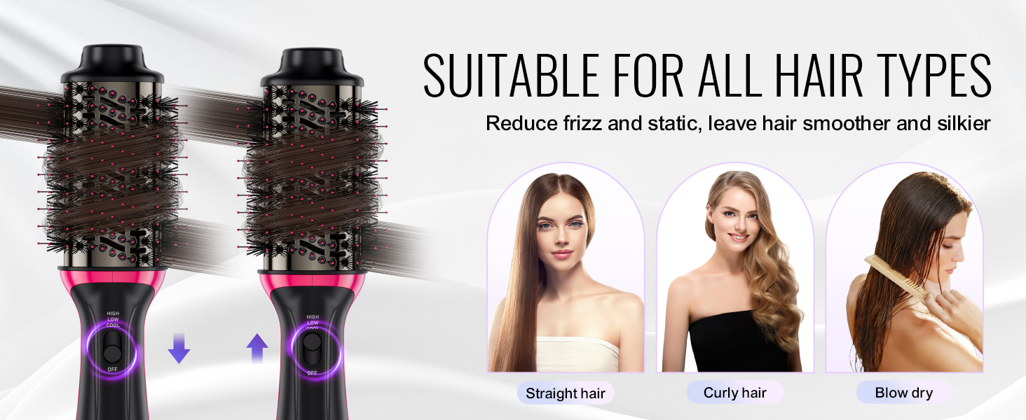 Naša multifunkčná teplovzdušná stylingová kefa je ideálna pre všetky typy vlasov, bez námahy si poradí s rovnými, kučeravými aj sušiacimi potrebami. Vďaka 3 nastaviteľným nastaveniam (chladné, nízke a vysoké) ju môžete ľahko prispôsobiť rôznym potrebám stylingu a ľahko dosiahnuť svoj ideálny vzhľad.