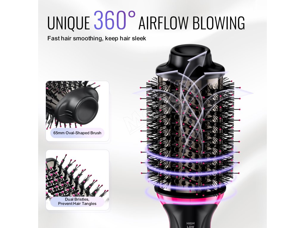 Vychutnajte si hladké účesy bez námahy vďaka nášmu 360° priestorovému prúdeniu vzduchu, ktoré dodáva rovnomerné teplo na zníženie krepovatenia. Oválna kefa s priemerom 2,56 palca (65 mm) je vybavená nylonovými kolíkmi a tupírovanými štetinami, ktoré zabraňujú zamotávaniu vlasov.